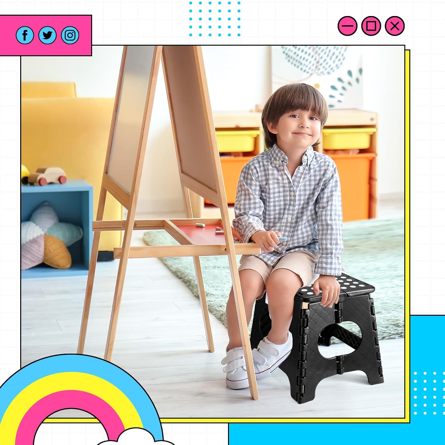 - Sturdy Folding Stool: The internal structural design 11 inch folding step stool in Black is unique makes the stool extra strong and safe. It can hold up to 300 lbs Max !!! Which is mainly used for indoor sitting. Please make sure the step stool is fully opened before use