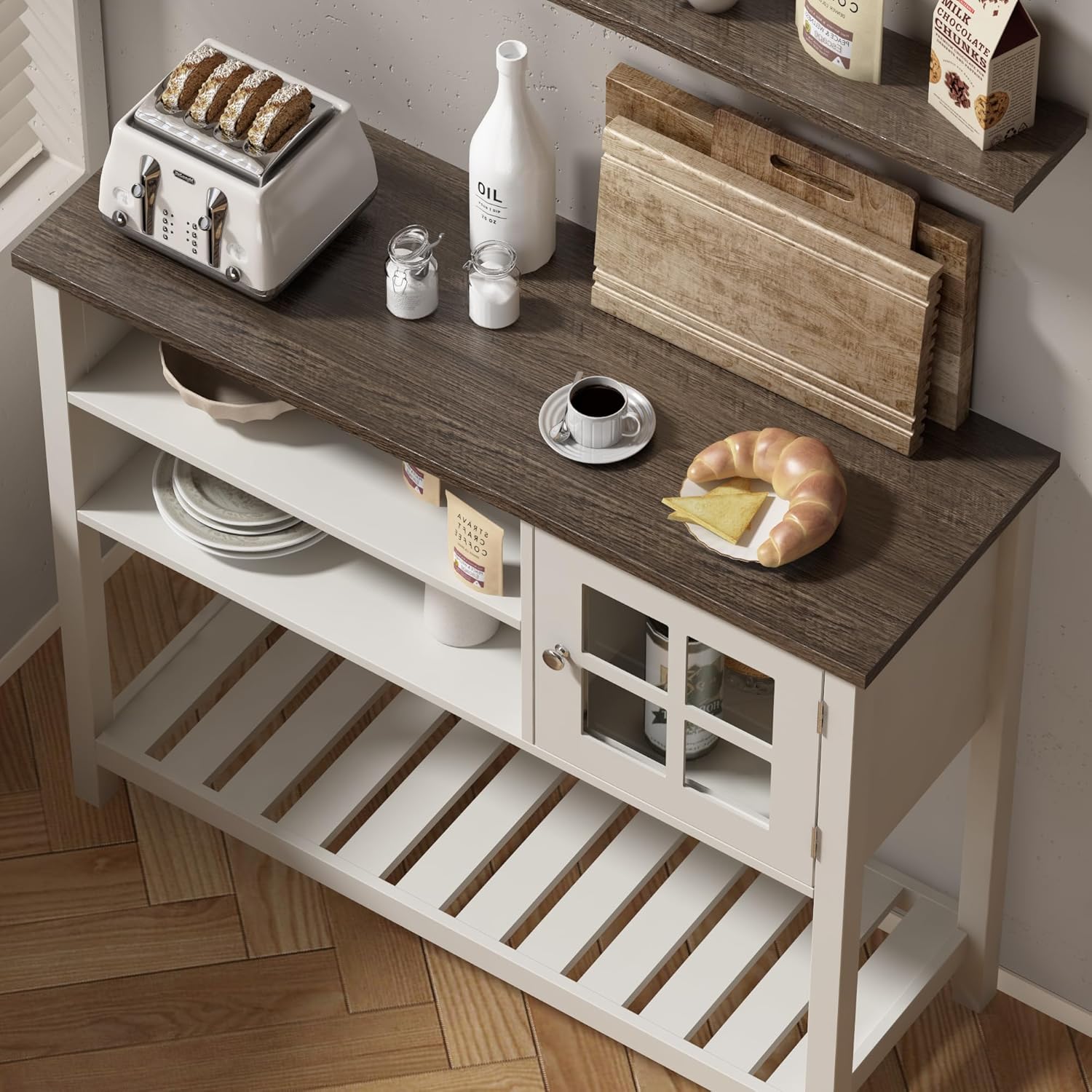 - 【Farmhouse Design】The coffee bar cabinet features a rustic light wood grain table top, smooth soft white body, and elegant silver handles, blending retro and modern to create a comfortable and charming farmhouse atmosphere in your home