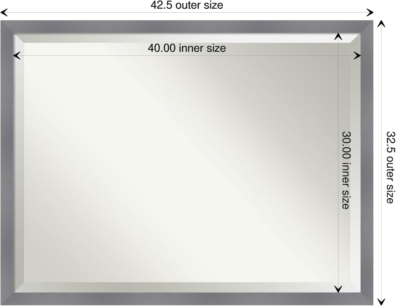 - MIRROR DETAILS: This mirror features premium glass for a clear, undistorted image and is finished with a beveled edge to give the glass a decorative touch. The overall size of this wall mirror measures exactly 42.5 x 32.5 inches, including the frame. Its reflective area measures 40 x 30 inches.