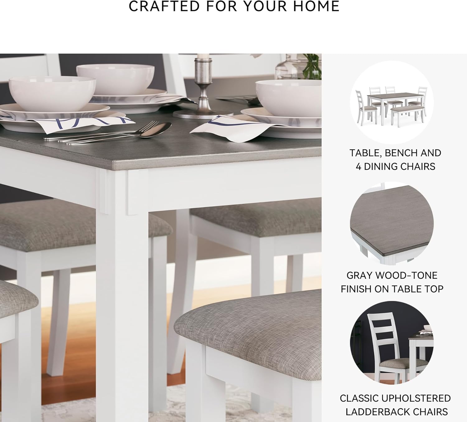 - COMFORTABLE SEATING: With plenty of room to gather around for dinner, the set’s 4 upholstered ladderback chairs are a classic, while the cushioned bench brings a modern sensibility to the table