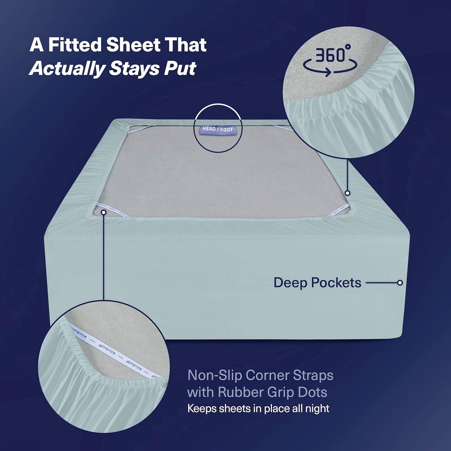 - SleepTight Tech Elastic Straps: Heavy-duty non-slip elastic straps in all four corners of our deep pocket Full sheets bamboo viscose and thick elastic all around ensure a snug and secure fit. Our extra deep pocket fitted sheet is designed to fit mattresses up to 18" inches.