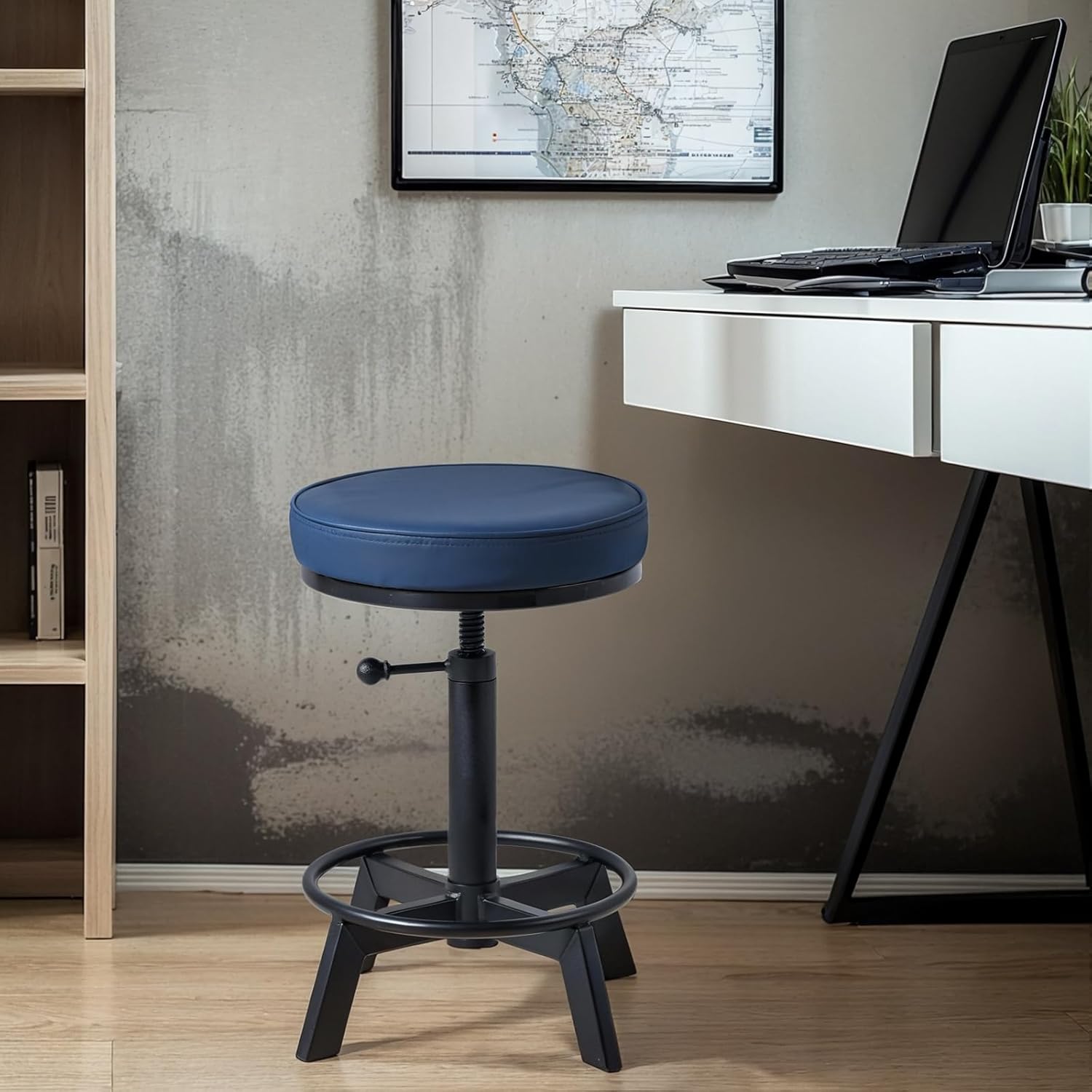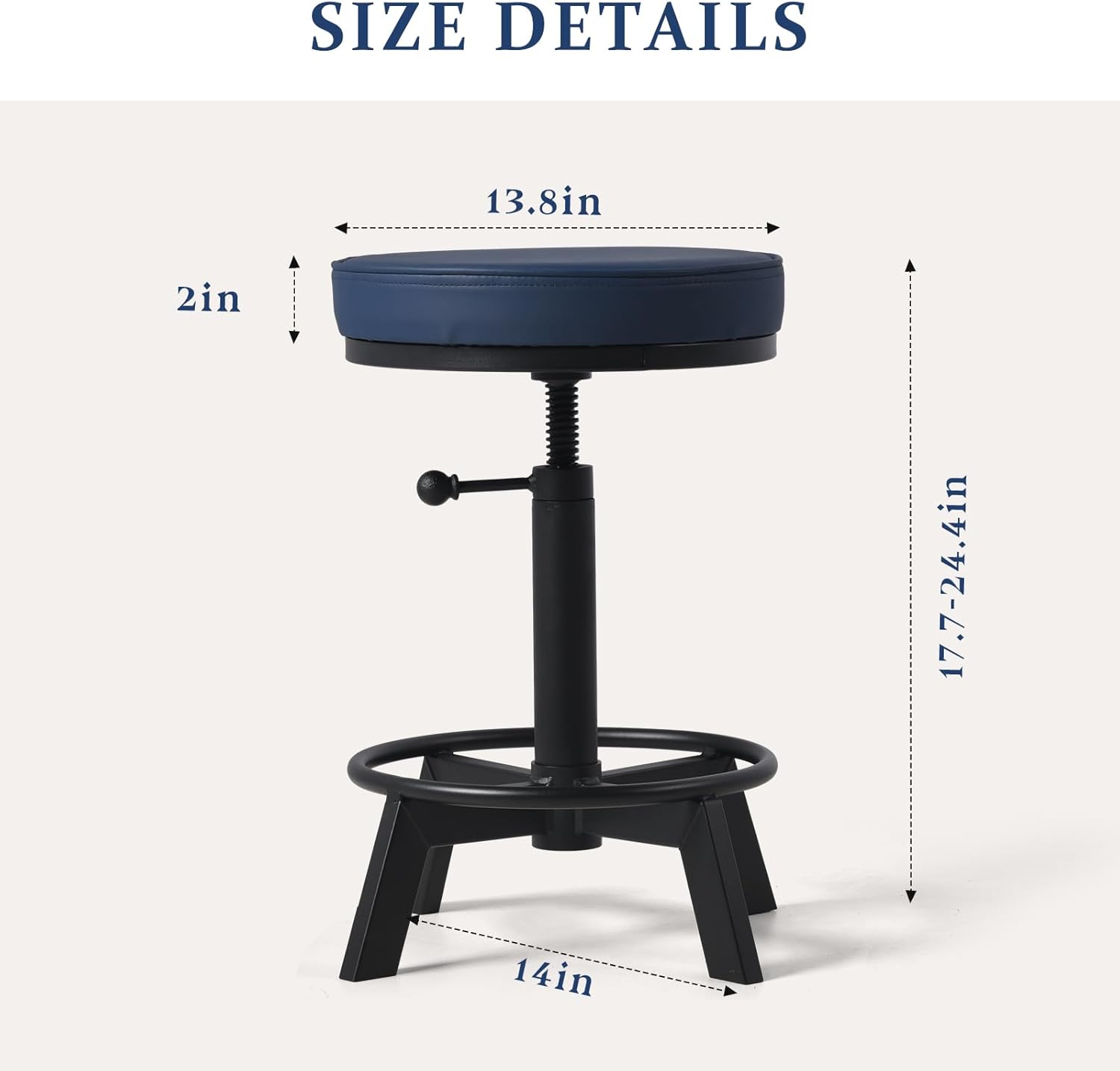 Vintage Short Bar Stools Industrial Swivel Counter Stools 17-24inch Height Adjustable Rustic Leather PU Seat Chairs for Kitchen Island Extra Seat Beside Sofa (Dark Blue)