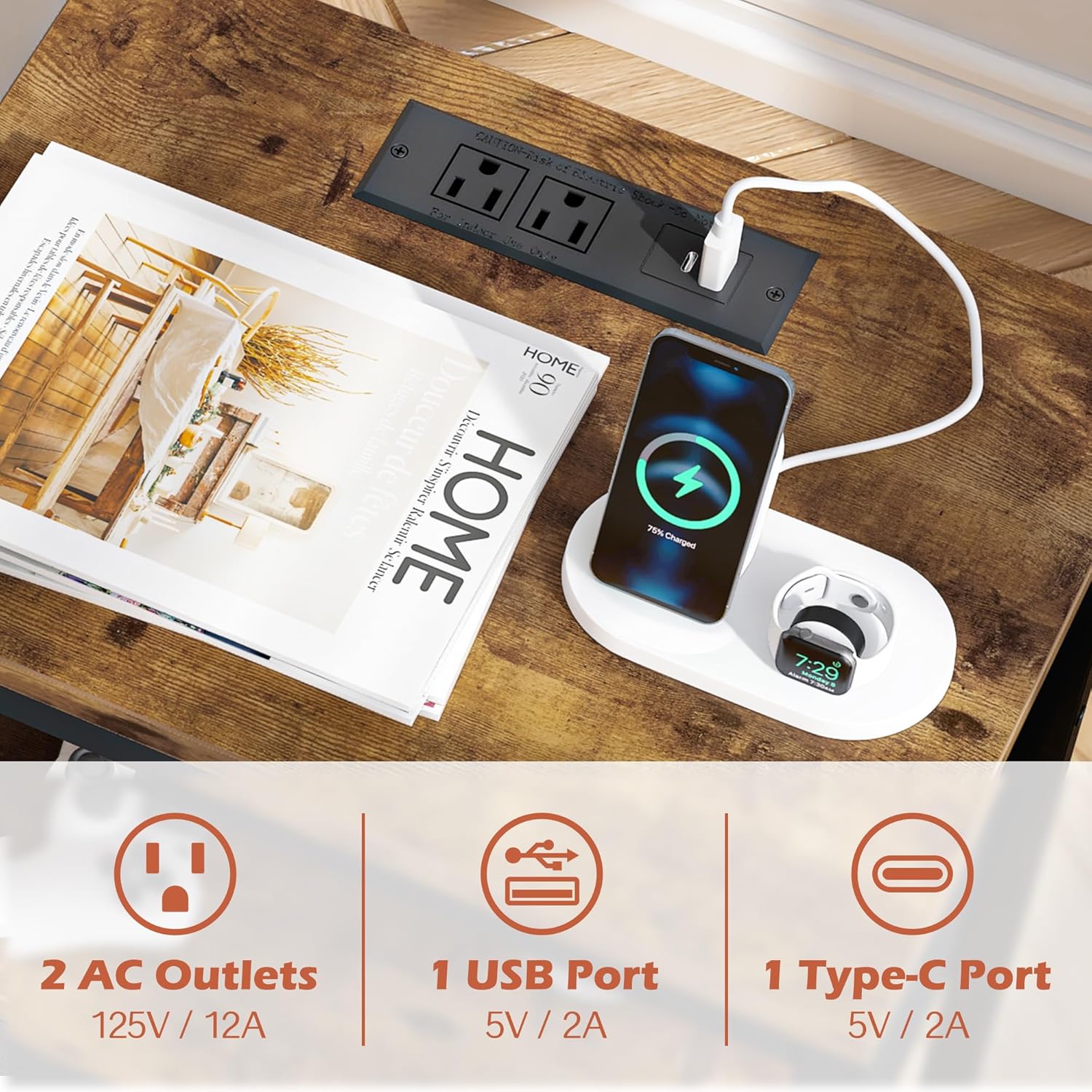 - 【Night Stand with Charger Station】: 1 USB port, 2 AC outlets, and 1 USB-C port are on the nightstand for bedrooms. Imagine plugging in your lamp, phone or watch before sleep, power is just within your reach, then be happy to greet the morning with fully charged devices