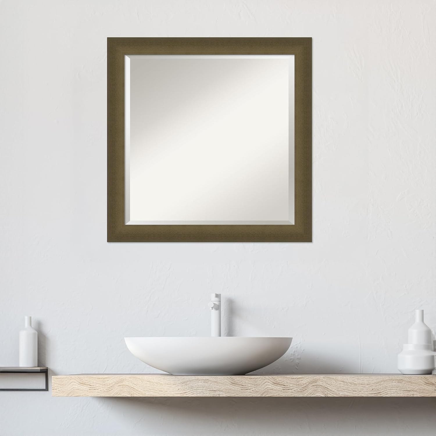 - MIRROR DETAILS: This mirror features premium glass for a clear, undistorted image and is finished with a beveled edge to give the glass a decorative touch. The overall size of this bathroom mirror measures 23.5 x 23.5 inches, including the frame. Its reflective area measures 20 x 20 inches.