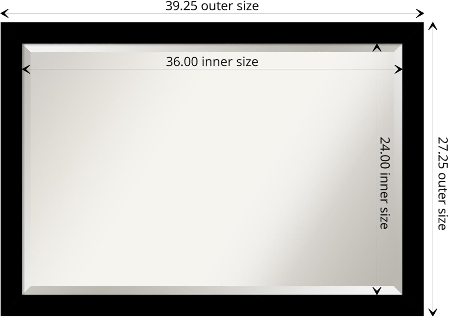 - MIRROR DETAILS: This mirror features premium glass for a clear, undistorted image and is finished with a beveled edge to give the glass a decorative touch. The overall size of this bathroom mirror measures 39.25 x 27.25 inches, including the frame. Its reflective area measures 36 x 24 inches.