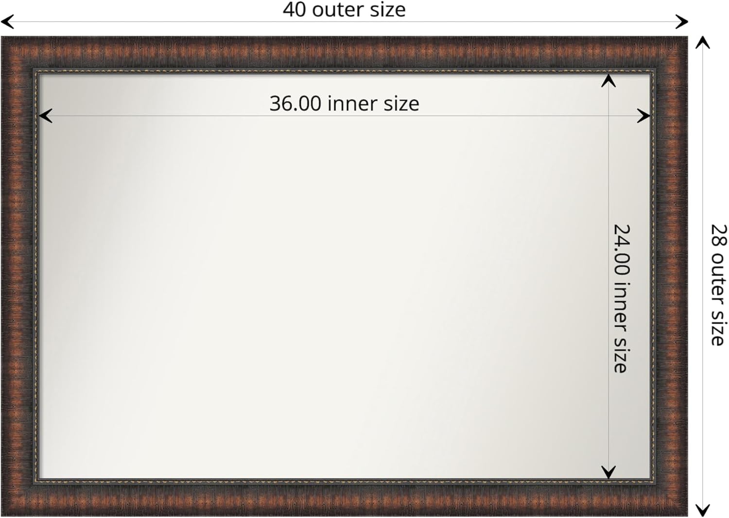 - MIRROR DETAILS: This mirror features premium glass for a clear, undistorted image and has a non-beveled surface to maximize the viewing area. The overall size of this bathroom mirror measures 40 x 28 inches, including the frame. Its reflective area measures 36 x 24 inches.