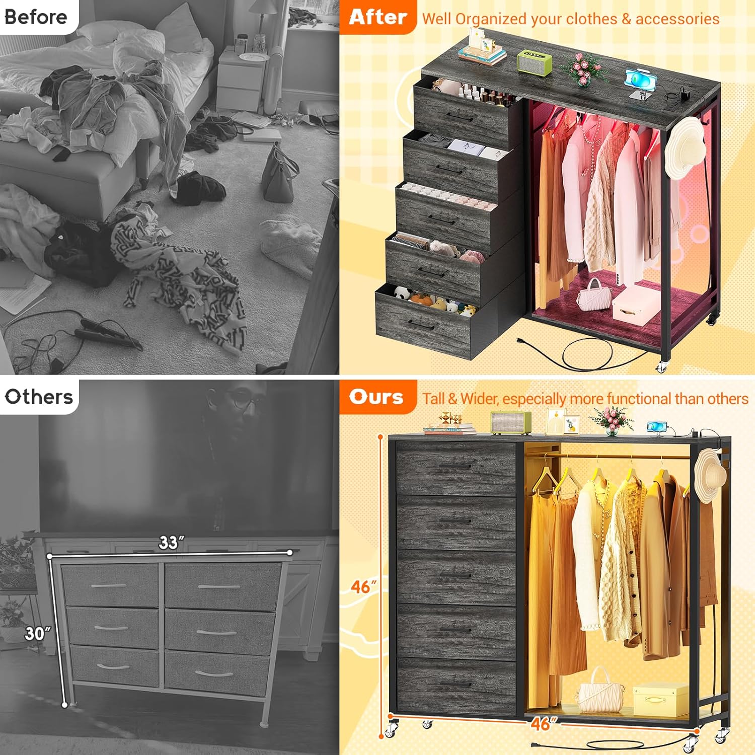 - 🧥【Charming and Magic LED Lights】 This chest of drawers equipped with 6000+ colors of light strips, can DIY any colors you like. With its timing and rhythm with the music function, you can enjoy and create any atmosphere at home.