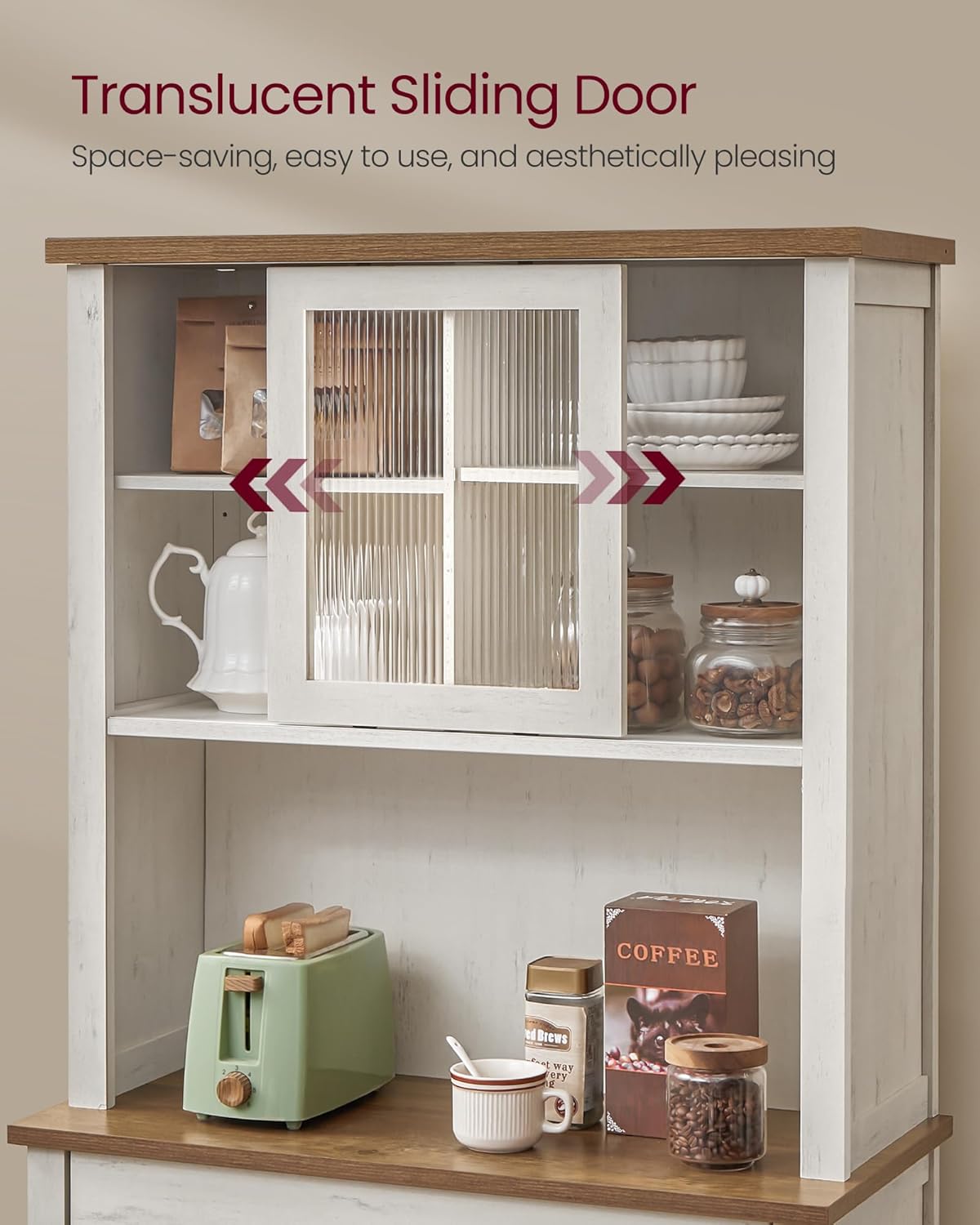 - [Storage Aplenty] This kitchen pantry cabinet features a top compartment with a translucent sliding door, a roomy countertop, a large drawer, and a bottom cabinet, providing ample space to neatly organize your various kitchenware and coffee essentials