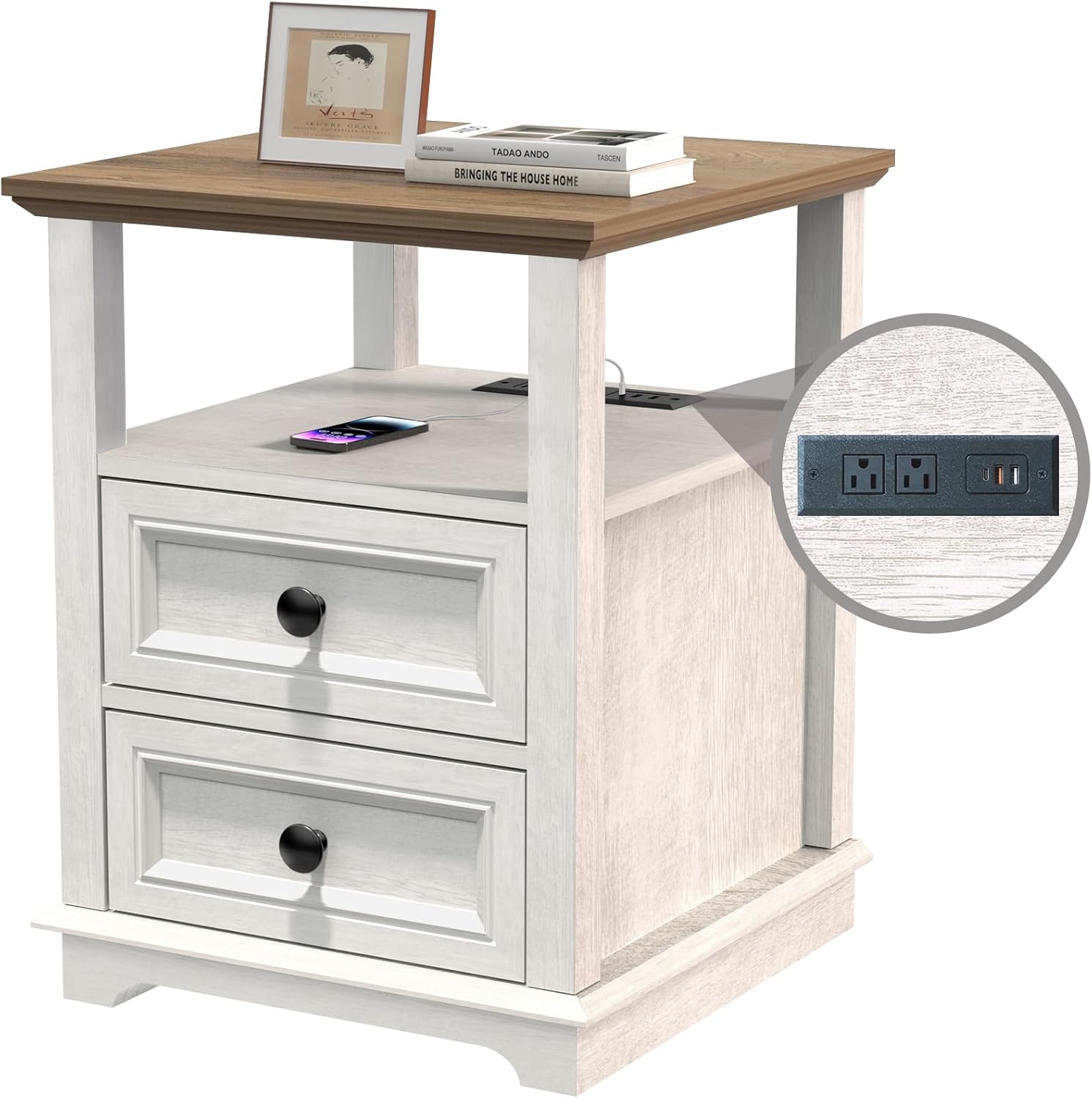 End Table with Fast USB C Charging Station, 18" Wide Tall Sofa Side Table with 2 Drawers, Large Storage Rustic Wood Square Storage Cabinet for Living Room,Bedroom,Office, White