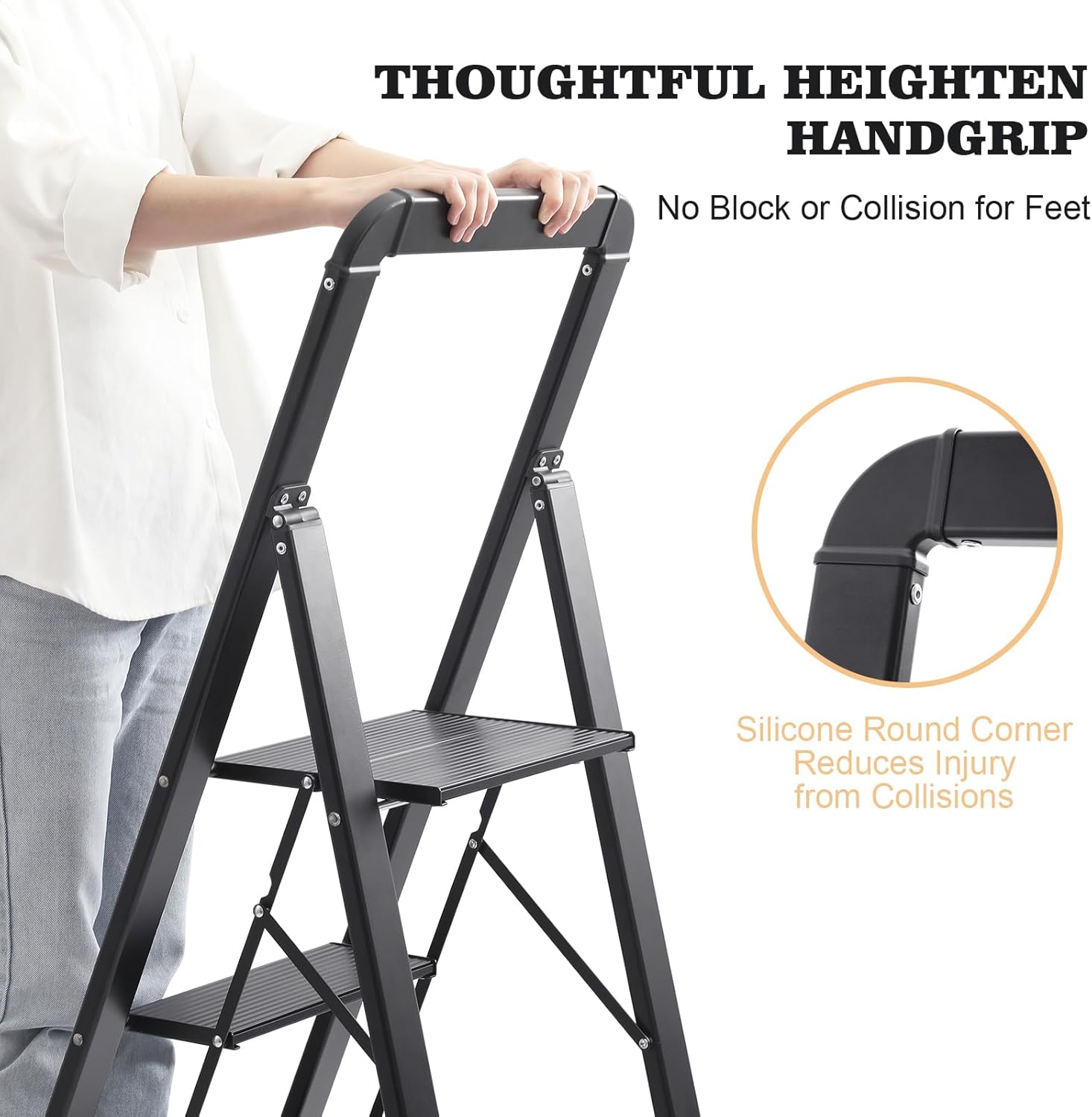 - 【Safety Lock & Sturdy Structure】: The step stool has a perfect triangular shape structure, and the cross metal support frame design on both sides, which can strengthen the support of the treads, making the ladder structure more complete and safer, the safety buckle design is located at the bottom of the top treads, which can make the top treads more stable and no wobble when you use it