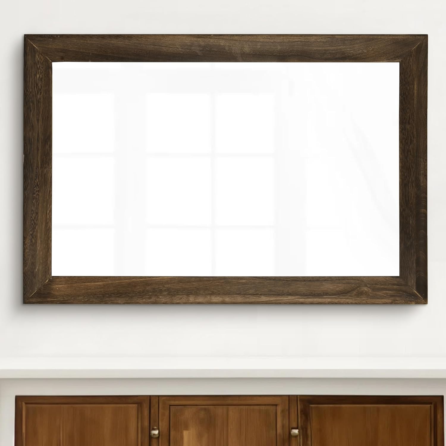 - [3MM Tempered Glass]The rustic wall mirror is made of tempered glass and walnut wood, which makes it free from any sort of distortion and provides a clear reflection. shockproof.The most importantbenefit of tempered glass is more safetythan others.and another benefit oftempered glass is its strength.it is hard to shatter.