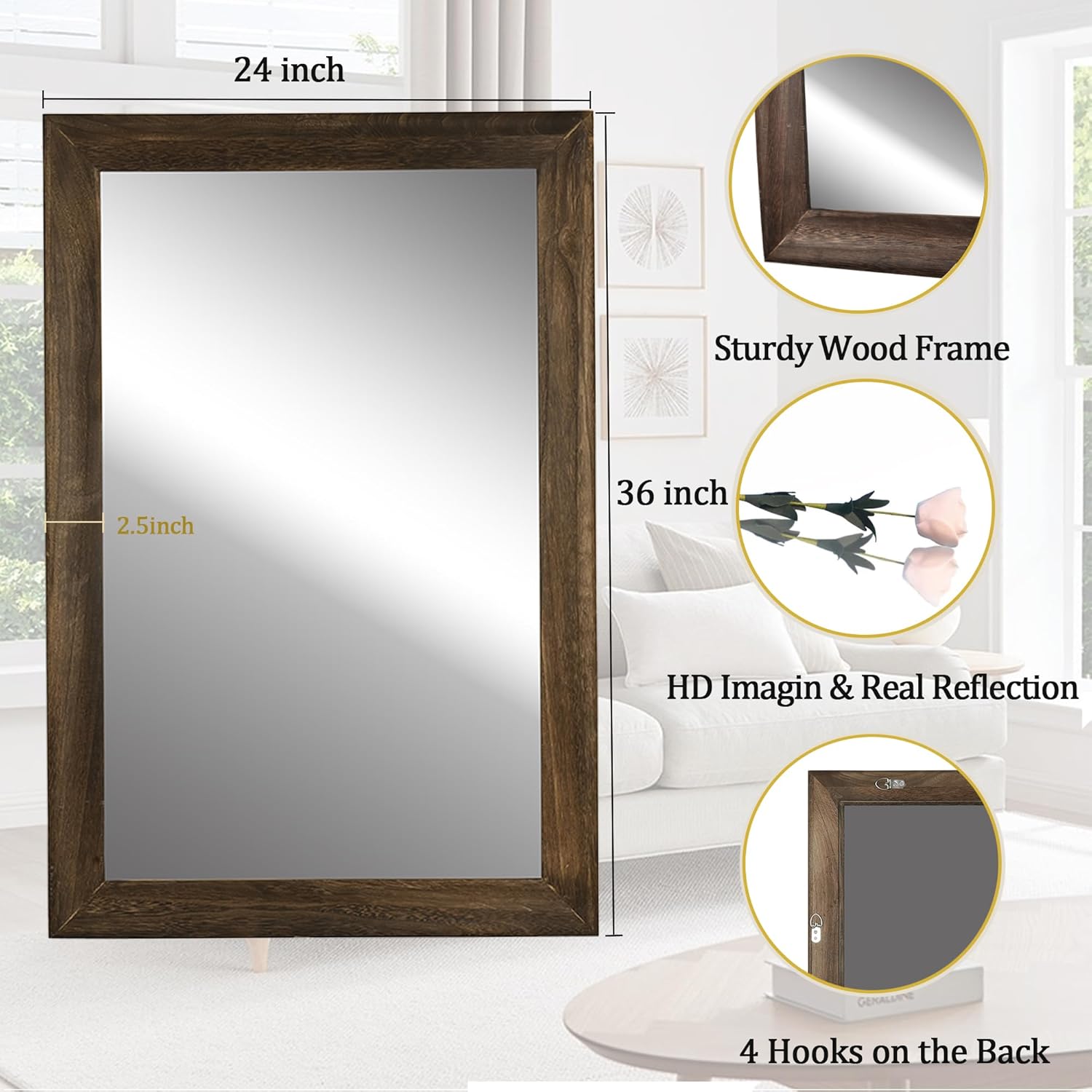 - [Easy To Install]This wall decor mirror comes ready to hang vertically or horizontally with pre-installed hooks.It can be safe and simple to hang for bathroom,living room or bedroom.The mirror dimension is 24 x 36 inches,All the mirrors are customized thick packaging and pass the drop test to ensure the safety of mirror transport.