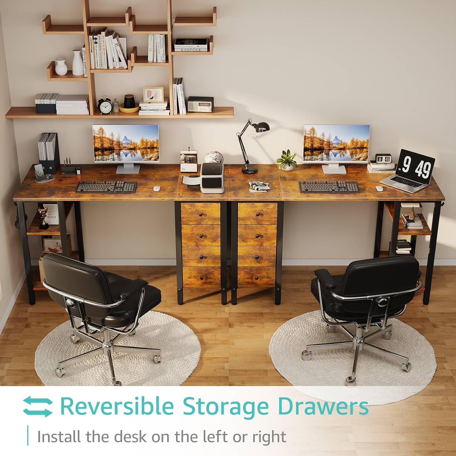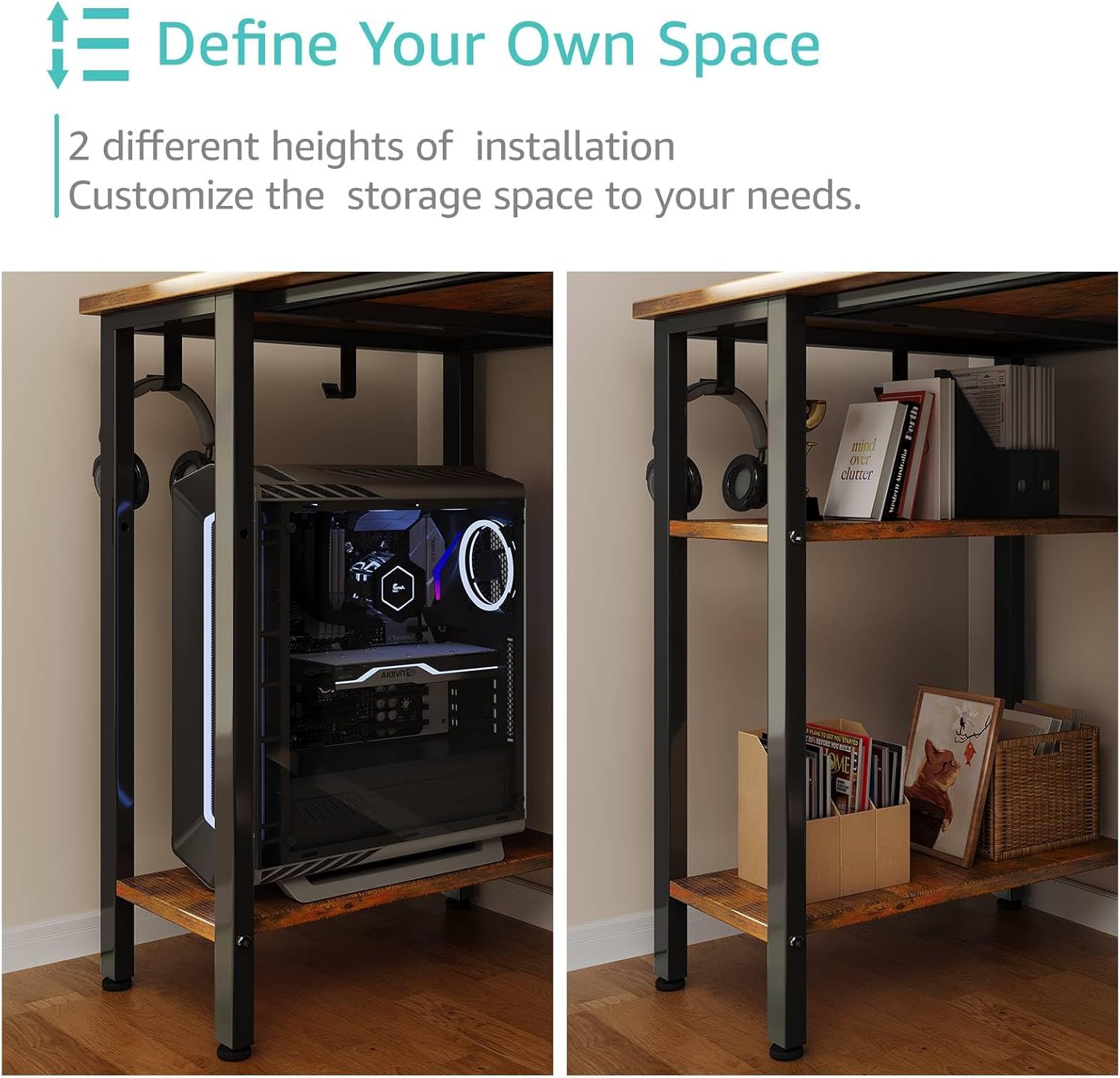 - Vintage Style Design: Computer desk with 2 storage shelves and 4 ππππ§ππ πΏπ§ππ¬ππ§π¨ with wooden front, you can try this two installation methods (left or right), and the shelves have two different heights of installation, you can customize the storage space to your needs. This desk is made of thick P2 particle wood board with scratch-resistant, anti-collision and waterproof, protect home office desk surface from daily wear and tear.
