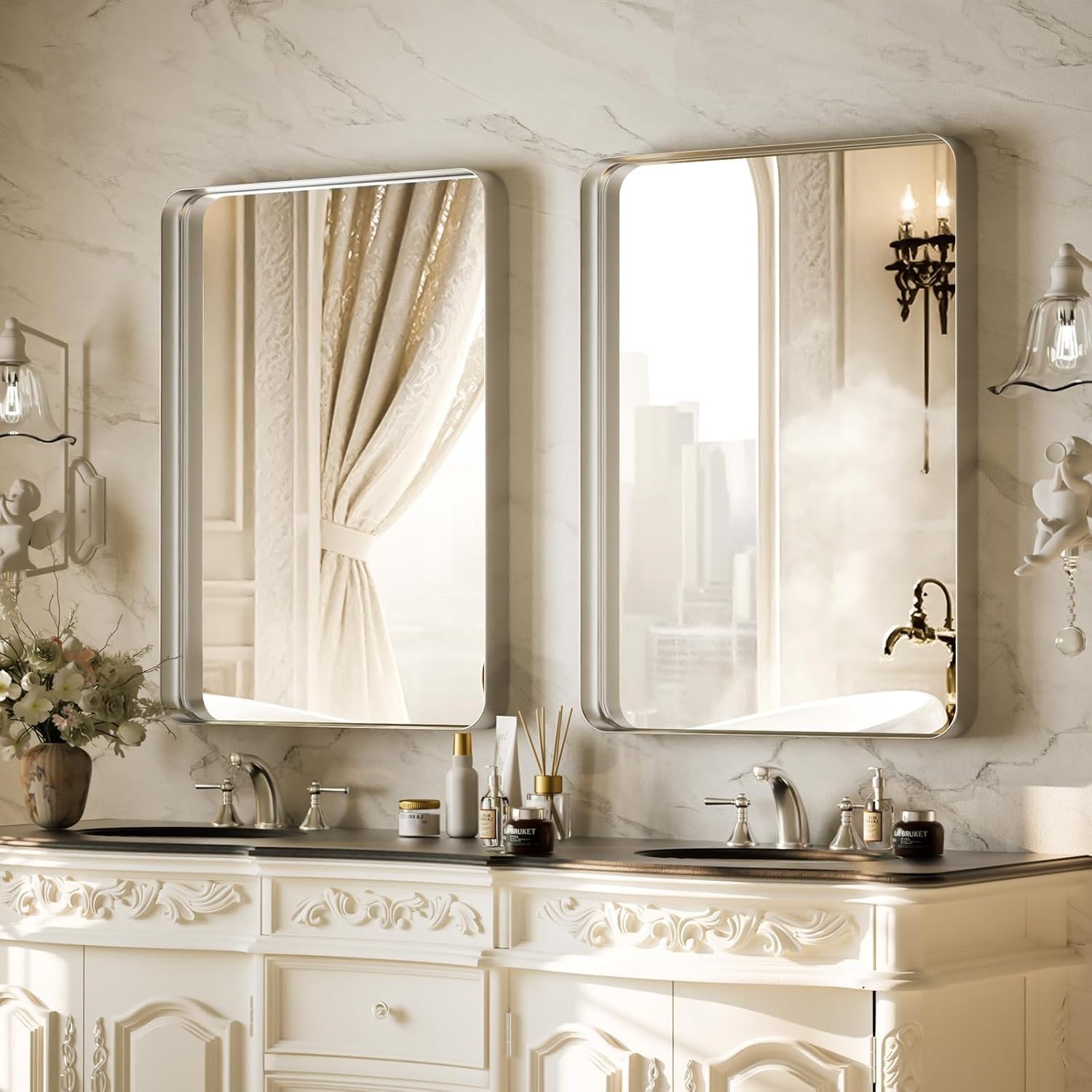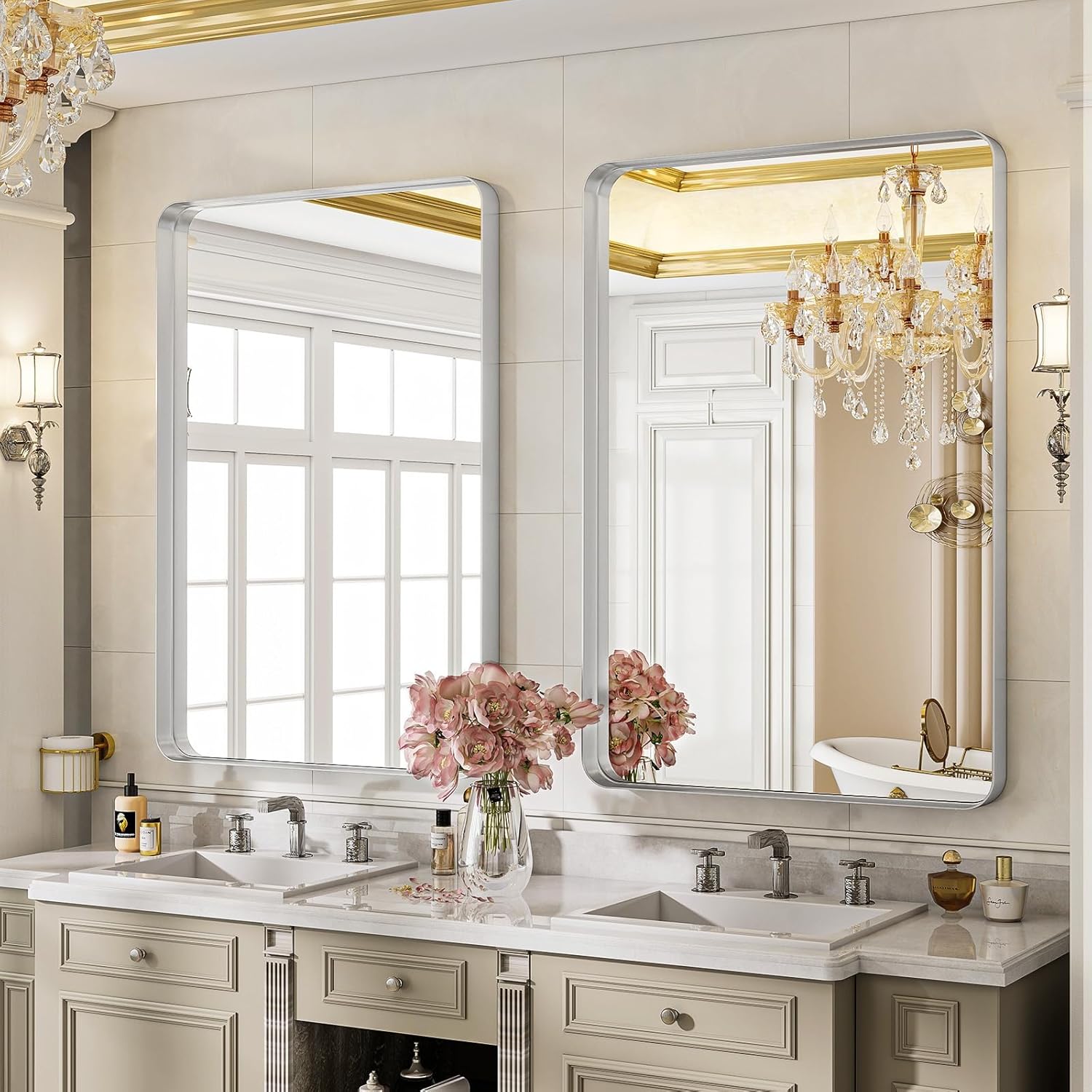 Bathroom Mirror 24x32 inch, Silver Gorgeous Deep Frame Wall Mirror, Modern Round Corner Bathroom Vanity Mirror for Bedroom, Living Room, Hanging or Leaning Horizontal or Vertical, Silver