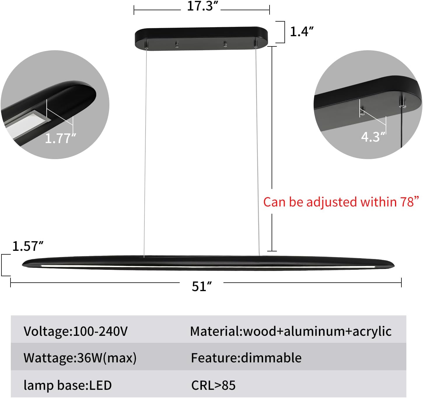 - ❤【Black Linear Pendant Dinning Room Light】This wood LED linear light is sleek and sophisticated with its matte black finsh. Dimensions:lamp body:39.4 x 2.6 x 1.6 inches(l*w*h).the mounting part:12.6 x 4.3 x 1.4 inches(l*w*h) can cover native American electrical box.the the cable length is adjustable up to 78 inches.notice:please do not use dimming switch,dimming equipment has been configured inside the light,please use ordinary wall button switch.otherwise the light fixture may flicker.