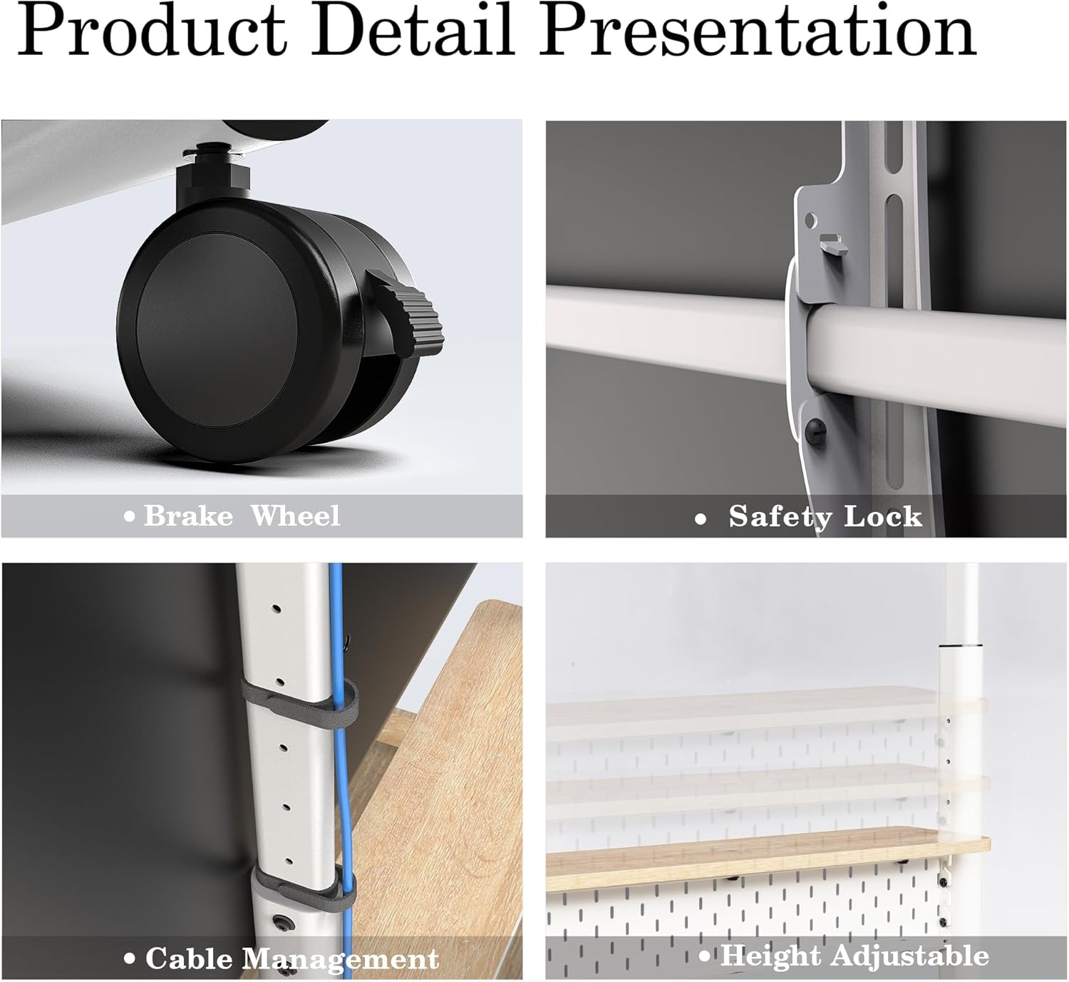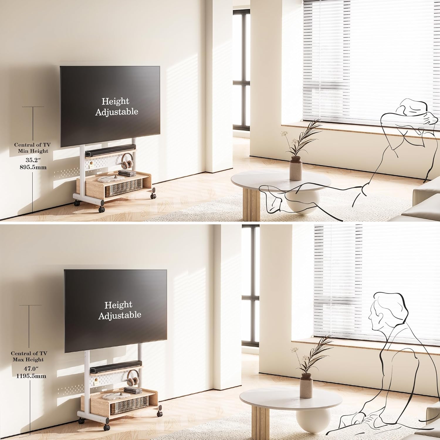 - 【Effortless Mobility with Lockable Wheels】Smooth-gliding 360° wheels make this rolling TV stand with wheels fit for any room. Move your TV effortlessly like a skateboard between living rooms, bedrooms, or offices, then secure it with one-touch wheel locks - no more unwanted sliding. The mobile TV stand on wheels design requires no tools or drilling, ideal for renters and flexible spaces