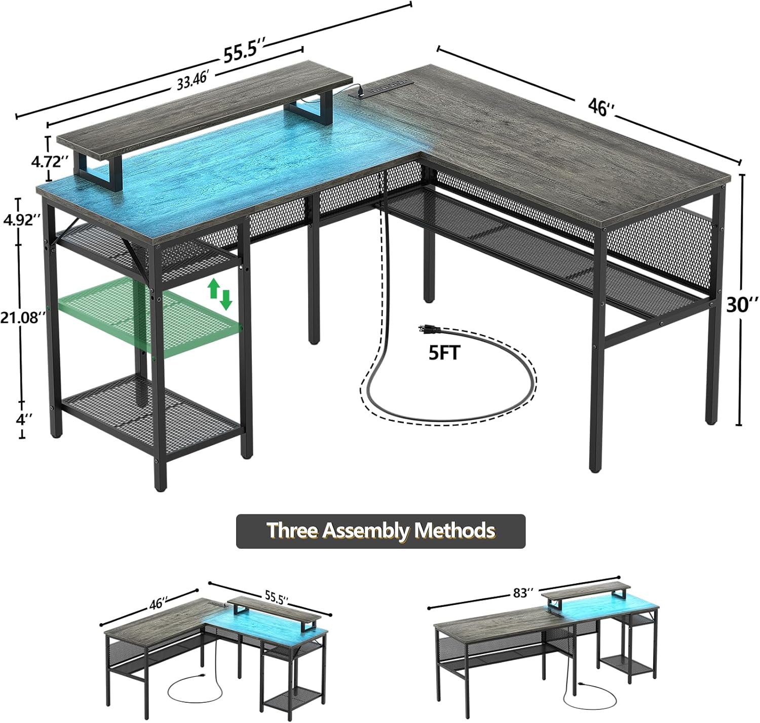 - ERGONOMIC MONITOR STAND AND FUNCTIONAL POWER STRIP: Raise your monitors to a comfortable viewing height, while reducing neck and eye strain. You will have a nice space underneath to keep a laptop or keyboard. With flexible design, the monitor stand also can be moved on either side as you need. The l shaped computer desk comes with a functional inset USB/outlet charging station. You can conveniently use it to charge your phone, laptop, gaming gear and other electronics.