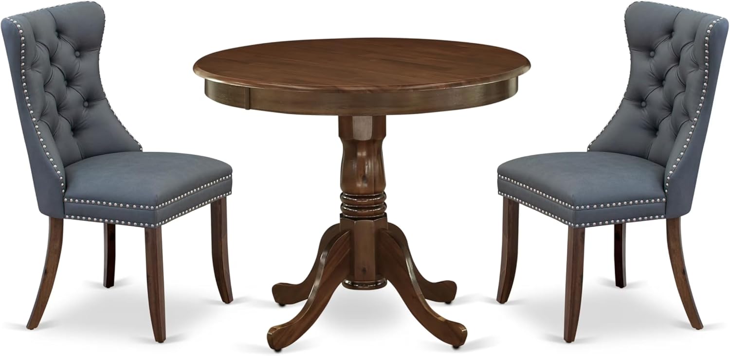East West Furniture ANDA3-AWA-13 3 Piece Kitchen Table Set Includes a Round Dining Table with Pedestal and 2 Polyester Fabric Upholstered Parson Chairs, 36x36 Inch, Antique Walnut