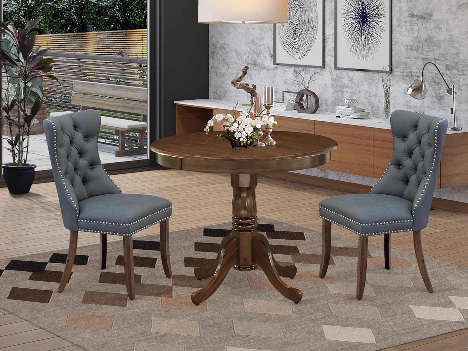 - KITCHEN TABLE SET FINISH: This mid century kitchen table set includes an Antique Walnut dinner table with a pedestal base and parson dining chairs in a stylish Platinum Gray color. The Antique Walnut finish adds a touch of vintage charm to your dining area, making it an elegant addition to any contemporary home. This dining table set is not only visually appealing but also practical, making it perfect for family gatherings and dinner parties.