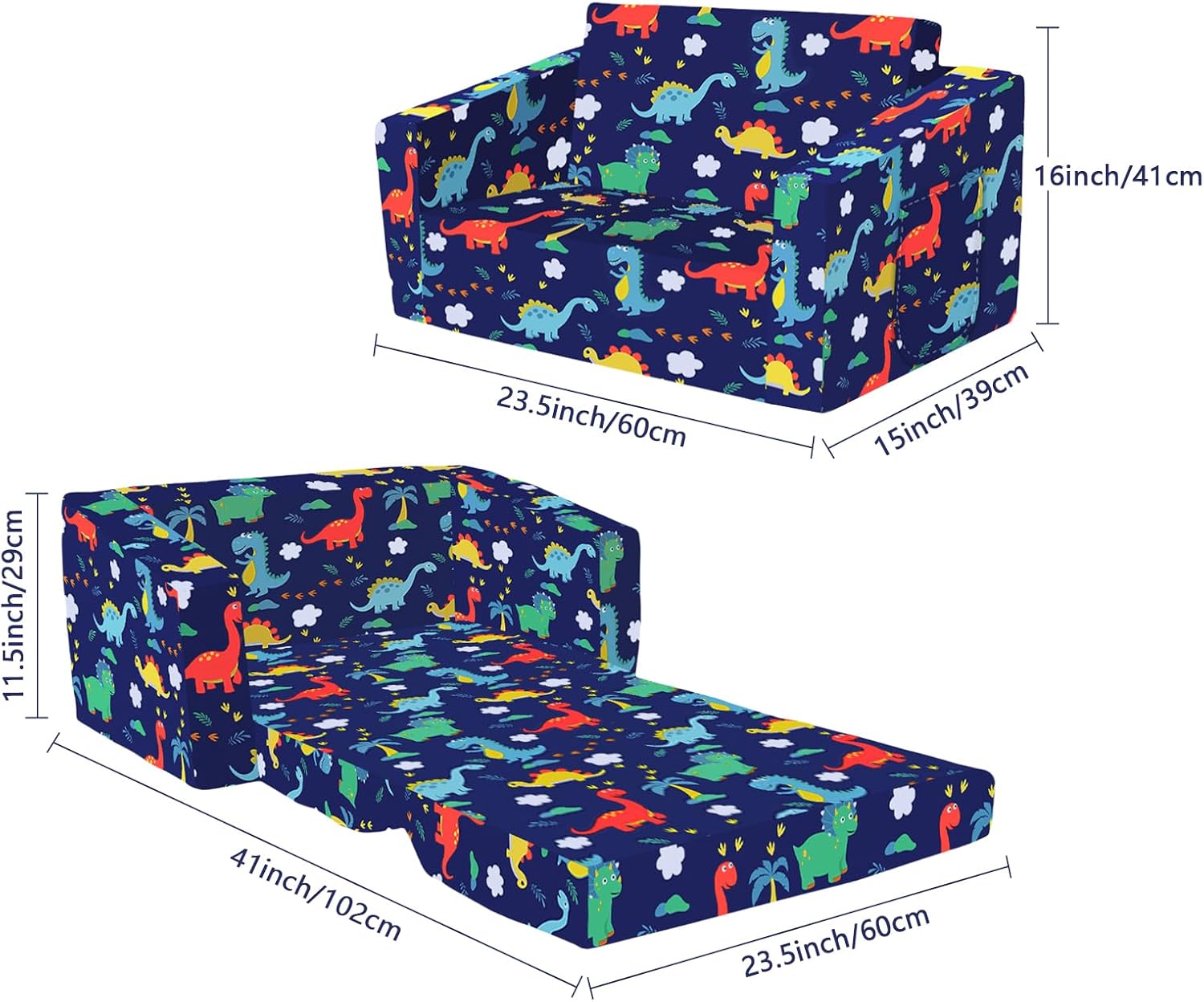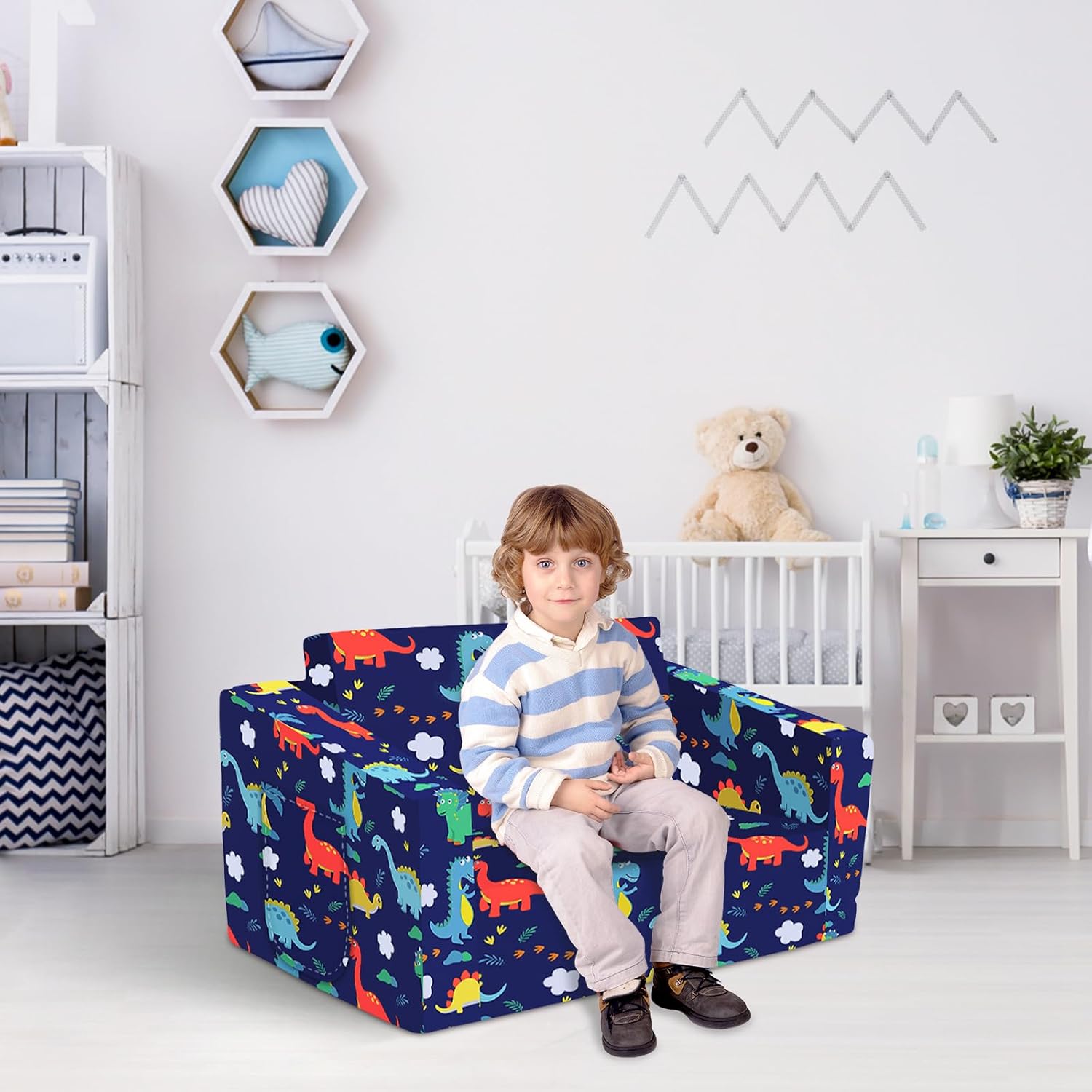 Kids Couch Convertible Sofa to Lounger for Toddler Boy, Foldable 2-in-1 Kids Sofa Bed, Toddler Chairs Comfy for Bedroom Playroom, Blue Dinosaur