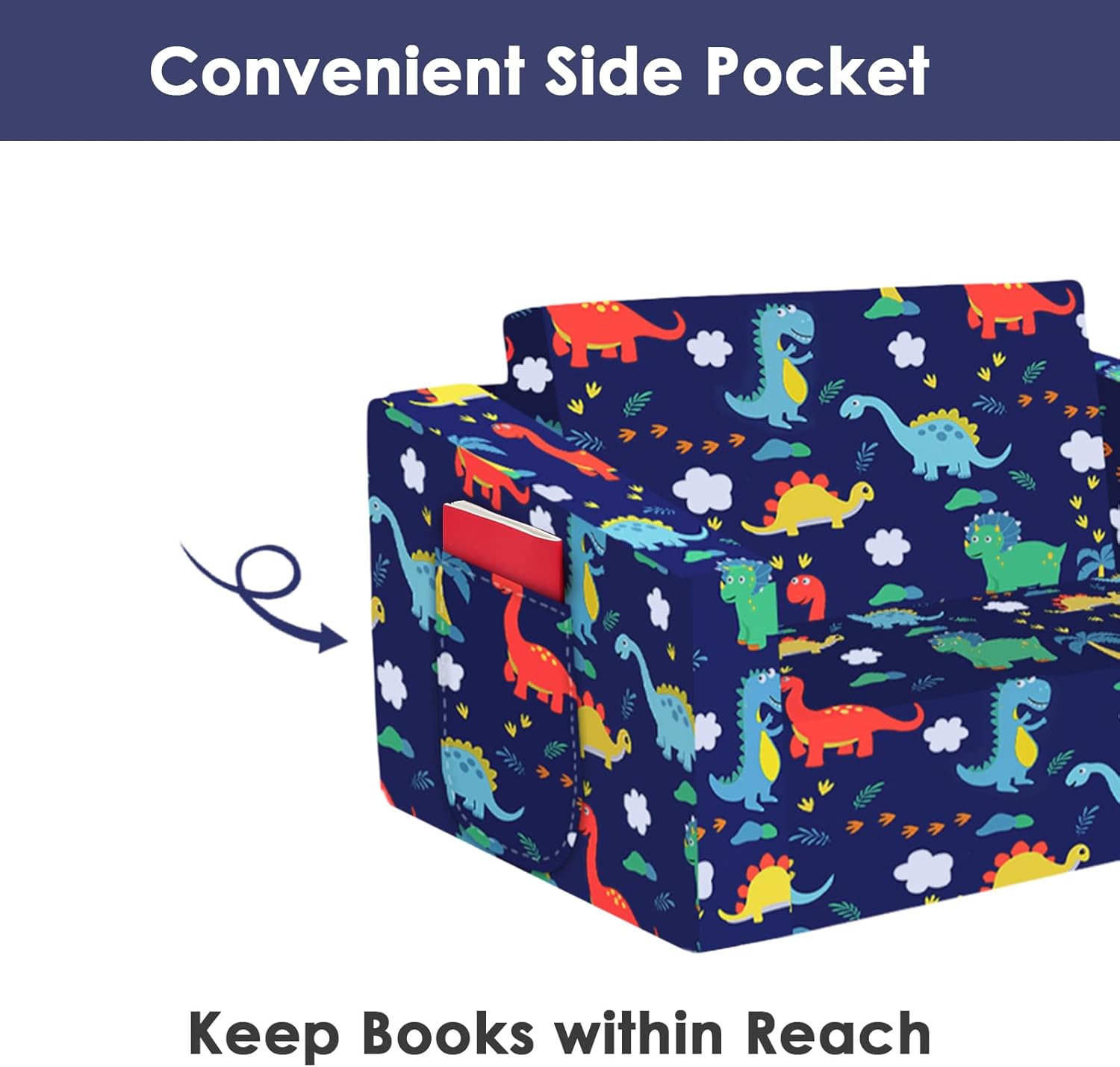 - 2-IN-1 Sofa & Sleeping Bed: This children sofa adopts a tri-fold design. When folded up it can become an armchair. Your kids can read, study, etc. on it; If unfolded it can become a sofa bed, the child can comfortably nap on it.The right side with a cloth pocket, you can put books, small toys, mobile phones, etc. in it, very convenient.