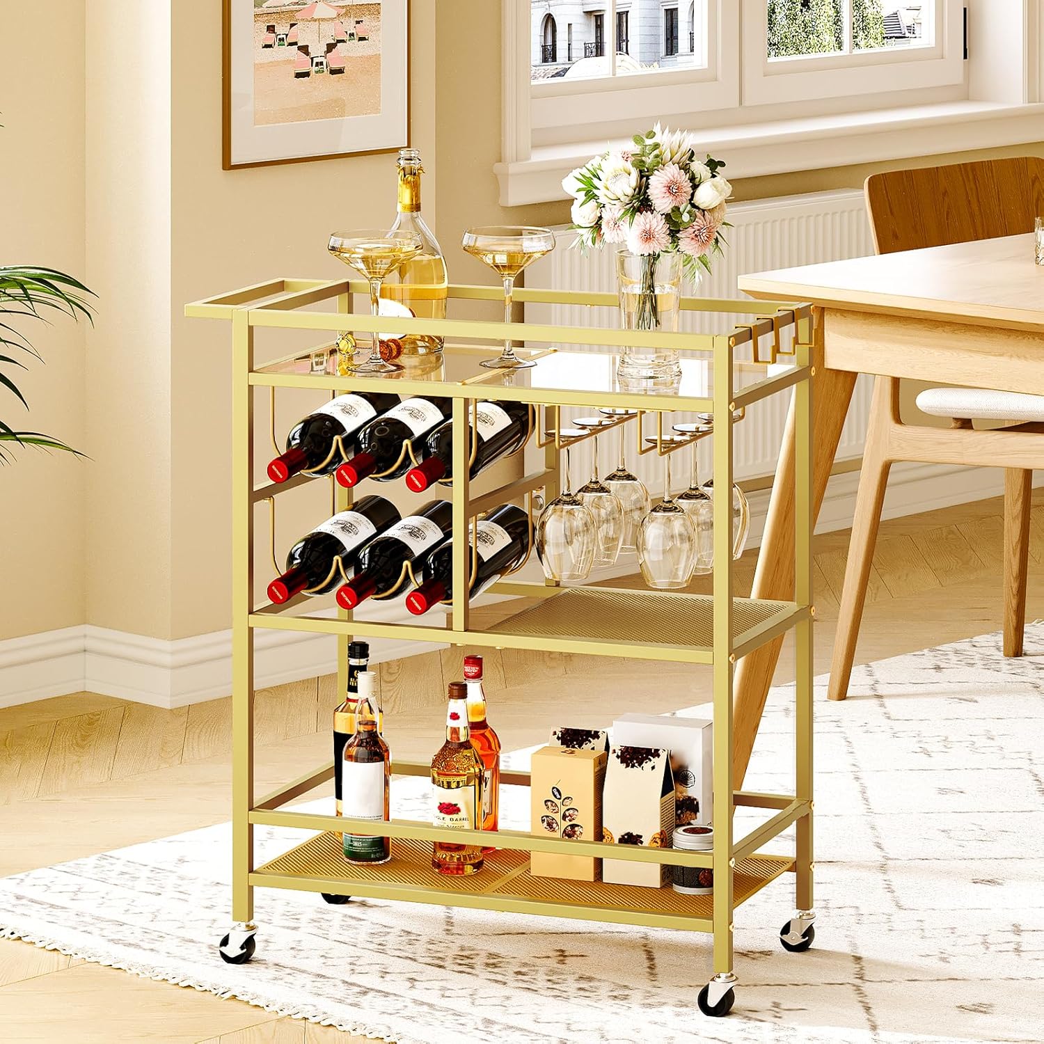 Bar Cart for Home, 3-Tier Serving Cart with Wheels and Handle, Beverage Cart with Wine Rack and Glass Holders, Rolling Wine Cart for Kitchen, Dining Room, Gold RCJ61B01