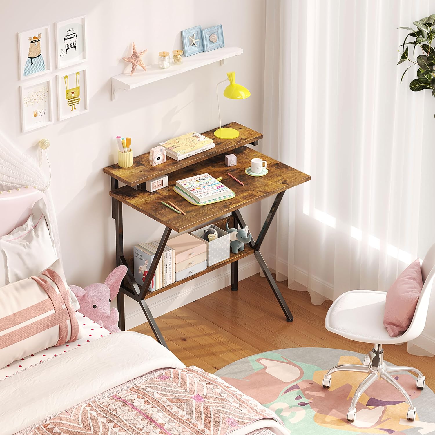 COTUBLR Small Desk, 27.5 Inch Small Computer Desk for Small Spaces, Computer Desk with Adjustable Monitor Stand, Compact Desk with Storage, Tiny Desk Study Desk for Bedroom Home Office, Rustic Brown