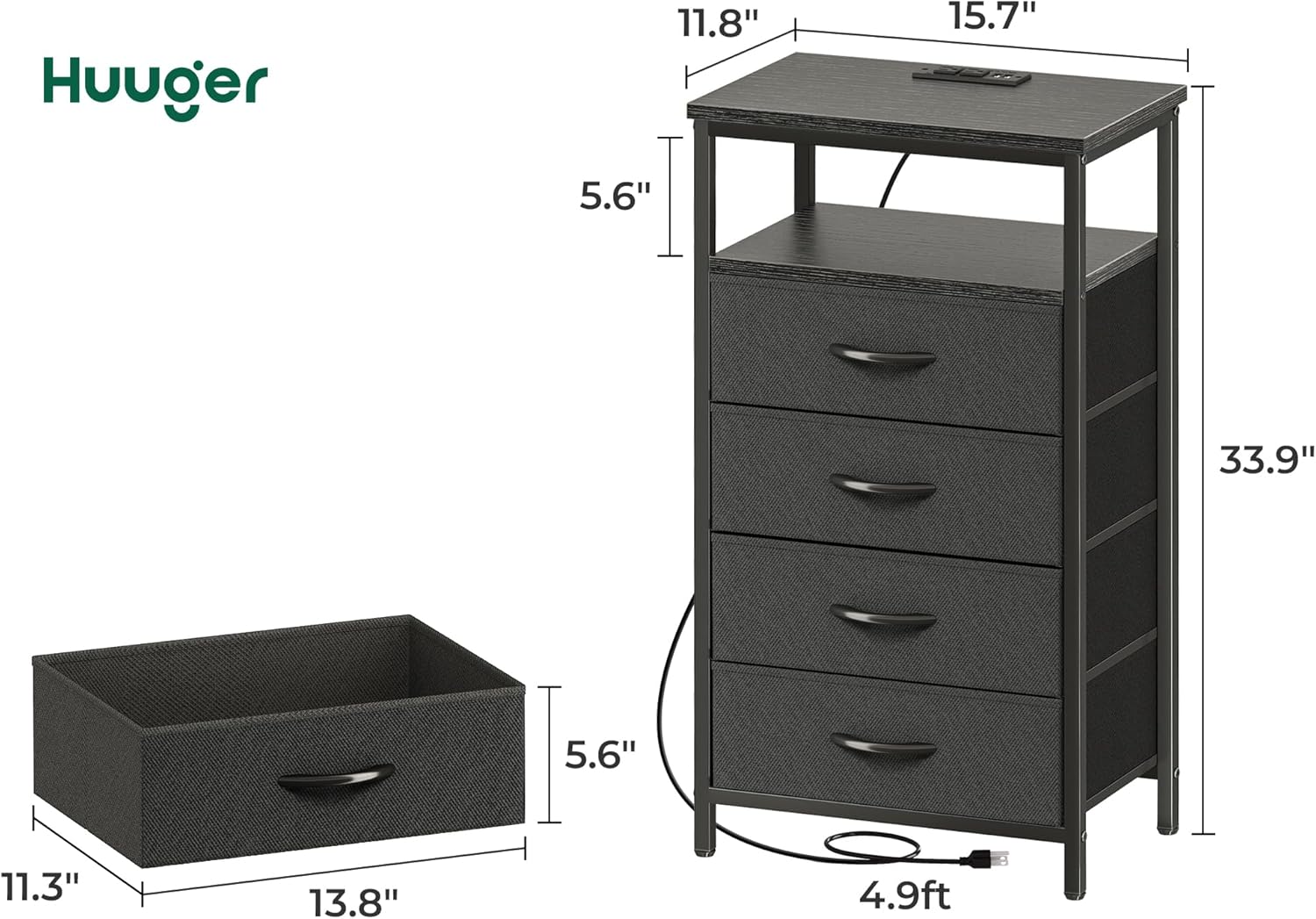 Huuger Night Stand with Charging Station, 4 Drawer Dresser for Bedroom, Bedside Table, 33.9 Inch Tall Nightstand with Open Shelf, End Table, for Closet, Entryway, Bedroom, Black