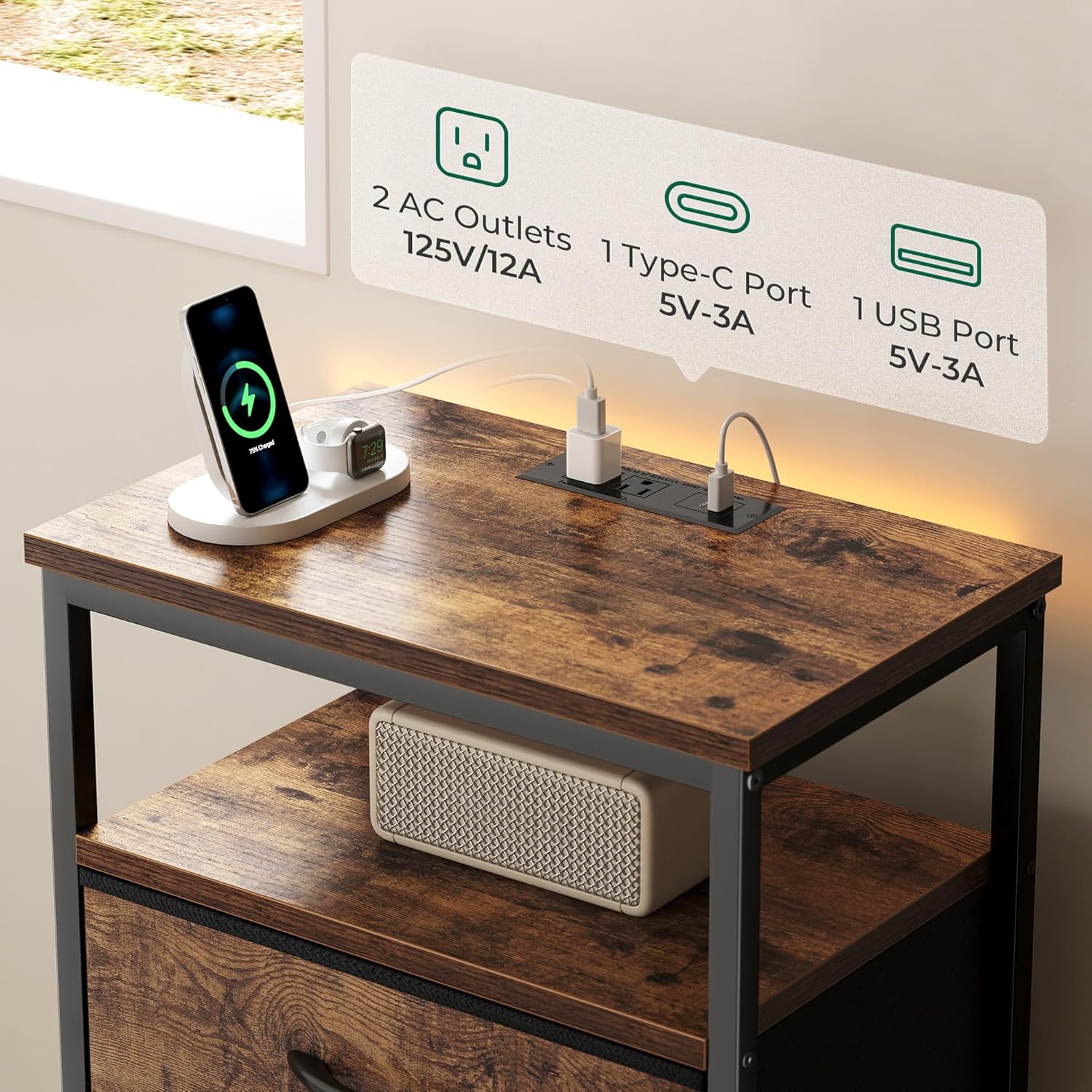 - 【Nightstand with Charger Station】More close charging spots, more handy uses. Equipped with 1 USB port, 1 USB-C port, and 2AC outlets on the tabletop, this fabric dresser allows you to effortlessly charge your devices or lamps overnight, ensuring you wake up worry-free with no low battery concerns. Plus: Contain patent pending drawer slide