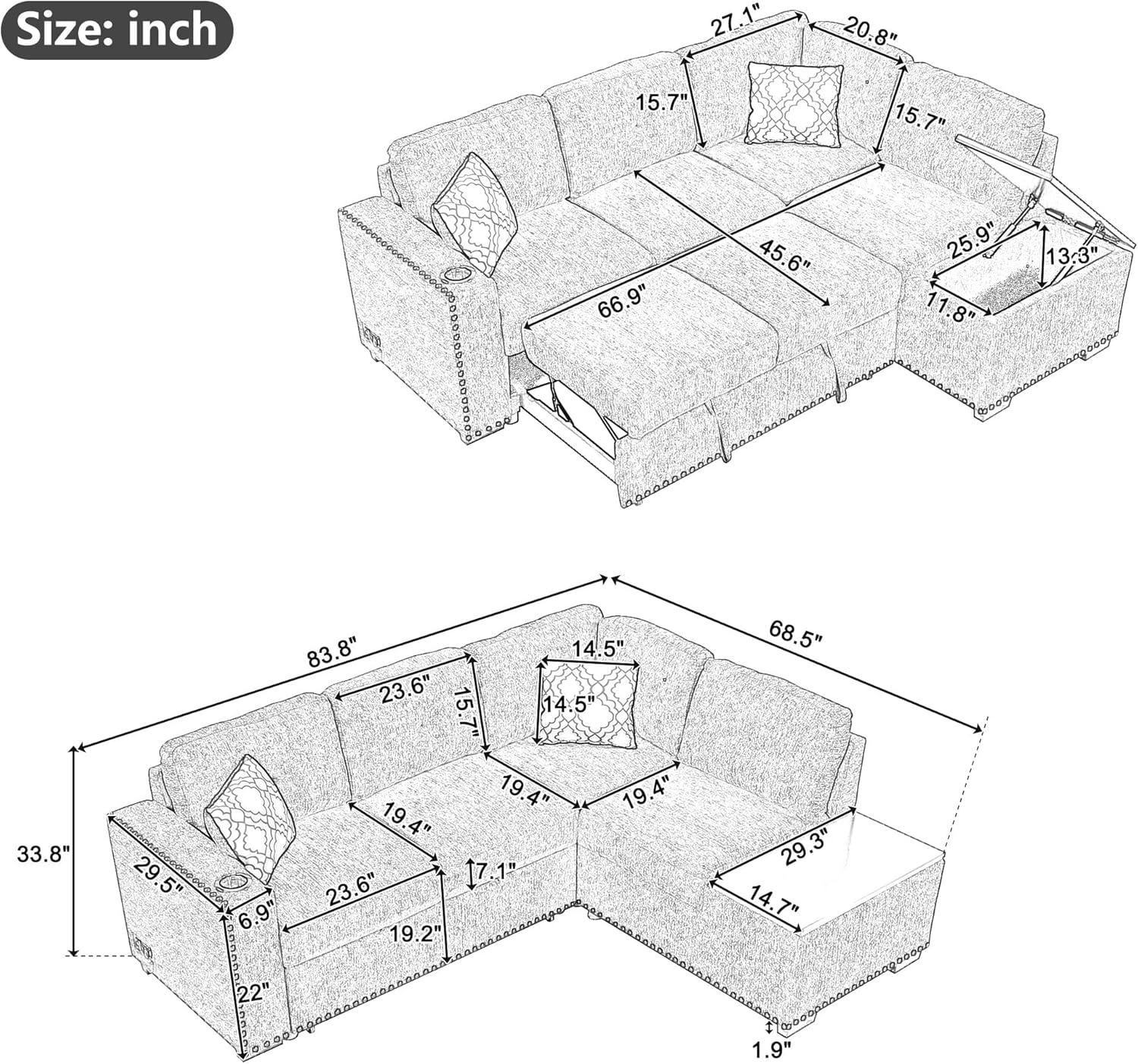 Merax Modern 83.8" Sectional Couch Bed with Storage Chaise/USB Ports/Cup Holder, L-Shape Pull Out Sleeper Sofa for Living Room, Black