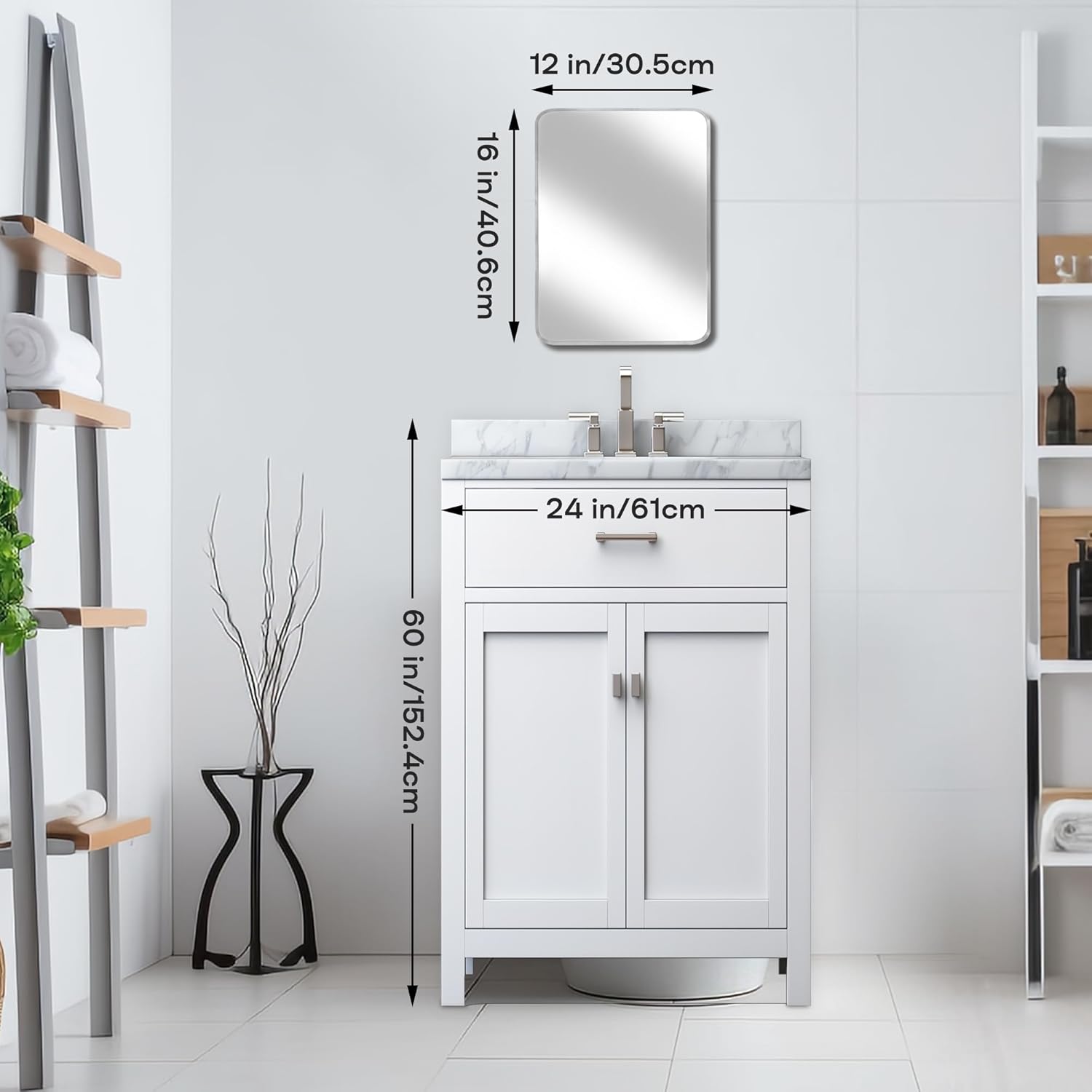 Wall Mount Small Mirror, Brushed Silver Metal Framed Rounded Corner Rectangular Makeup Mirror for Bathroom, Bedroom, Living Room (12" x 16", Silver)