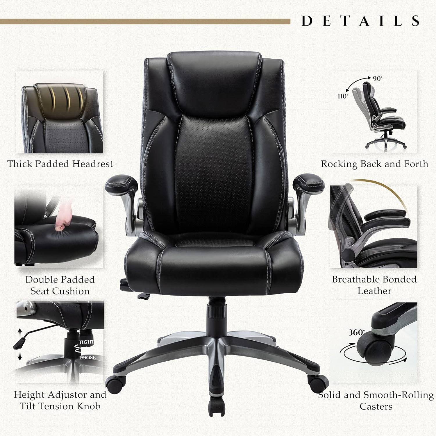 Executive Leather Office Chair, Ergonomic Office Chair with Adjustable Lumbar Support,High Back Computer Desk Chair, Flip-up Arms, Swivel Rolling Home Office Work Chair for Adults, Men, Women (Black)