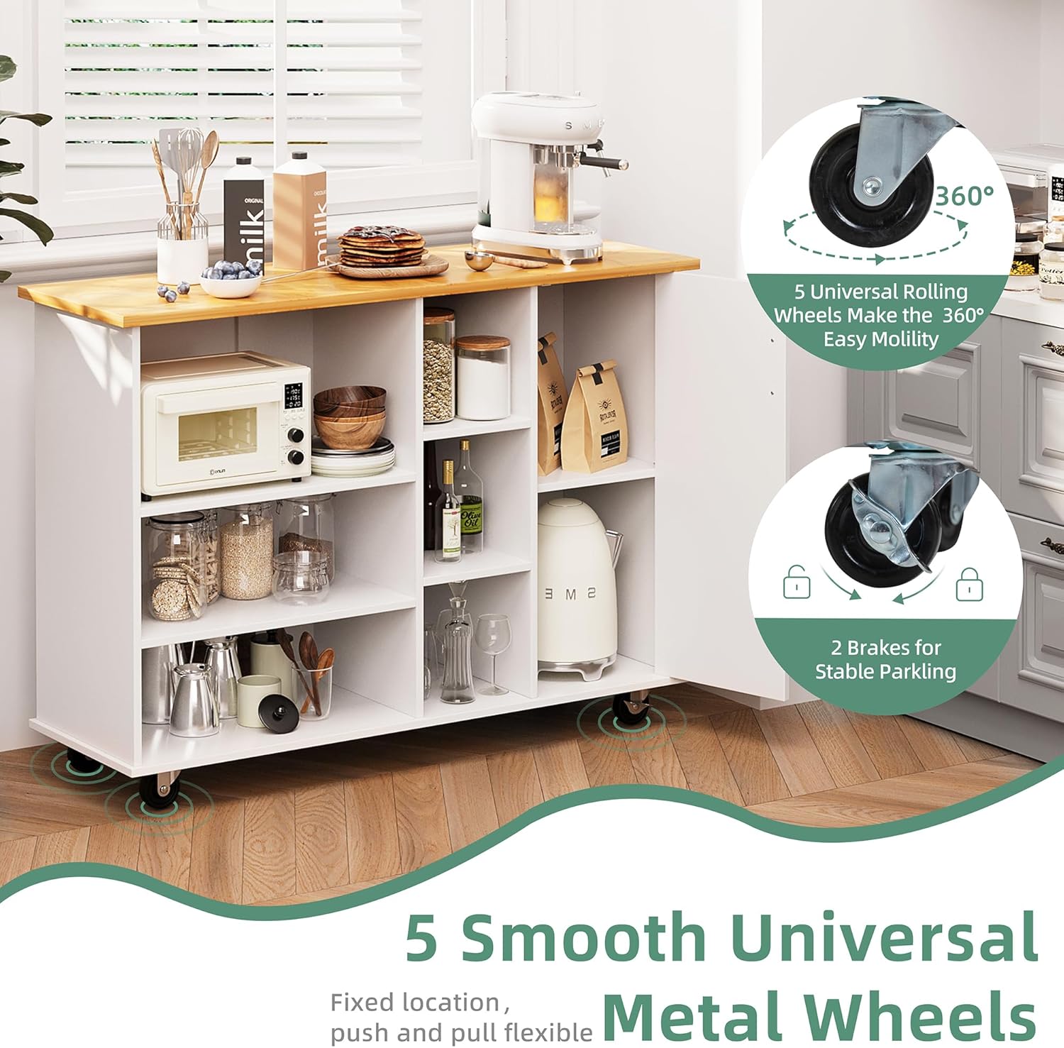 Shintenchi 47”W Kitchen Storage Island Cart with 6 Open Shelves and 1 Cabinet, Portable Trolley Cart with Wood Work Top and Handle/Towel Rack, White