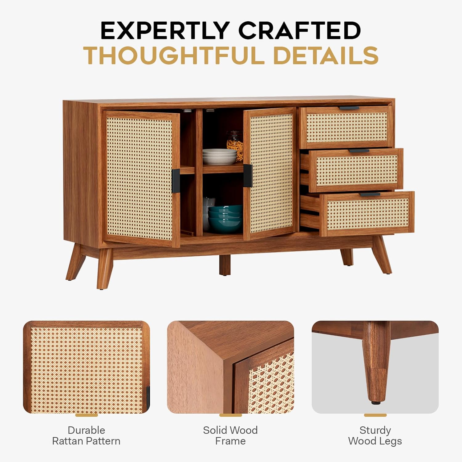 Bme Rattan Pre-Assembled Buffet Sideboard with 3 Drawers & 2 Doors, 58" Accent Console Table Living Room, Kitchen, Dining, Dark Chocolate, Jasper Storage Cabinet