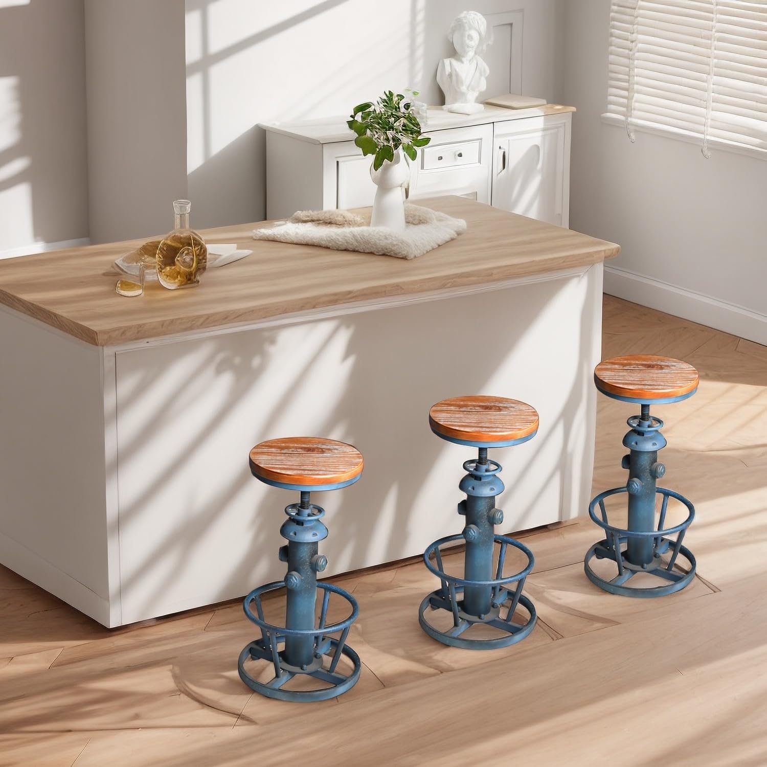 - [Perfect Handcraft] Powder coating craft protect bar stool from rust; Chair feet are fitted with rubber, avoid scratching the floor. TWO-TONE FINISH: Brown and Blue are the perfect blend for industrial-chic style to flourish. Plus, the planked look on the seat adds even more urban oomph to your decor. They are adjustable leg height, so that makes them very versatile.