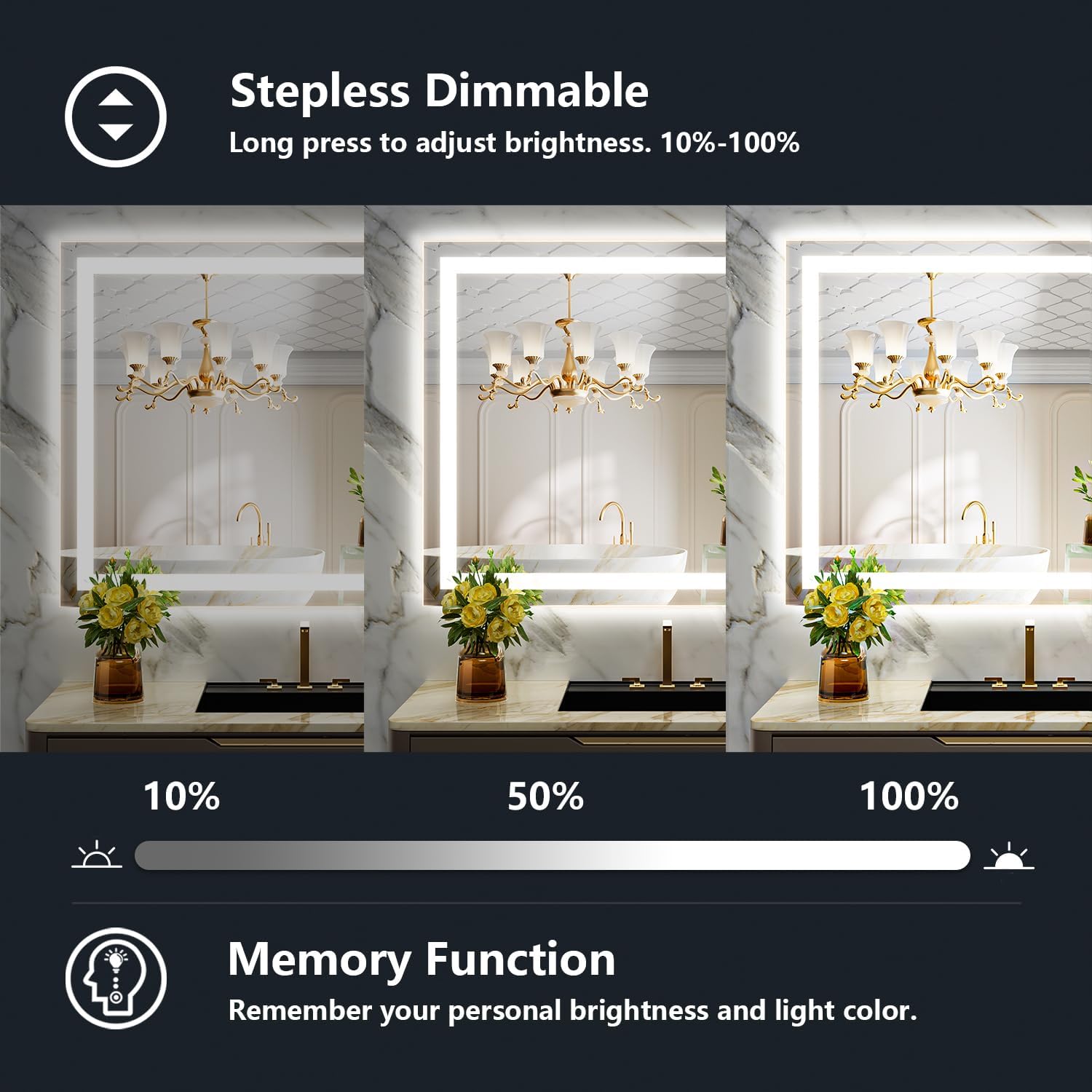- ✨【Color Changeable & Brightness Adjustable & Memory】- Yeelait lighted mirrors for bathroom wall features multiple light settings that are easily controlled with sensitive touch buttons. Short press the button to change the light color: White (6000K) - Neutral (4000K) - Warm(3000K), long press the button to dim the brightness to your comfortable level (100%~10%). The Smart Memory Function will record the lighting setting and keep the previous lighting status after turning off and on.