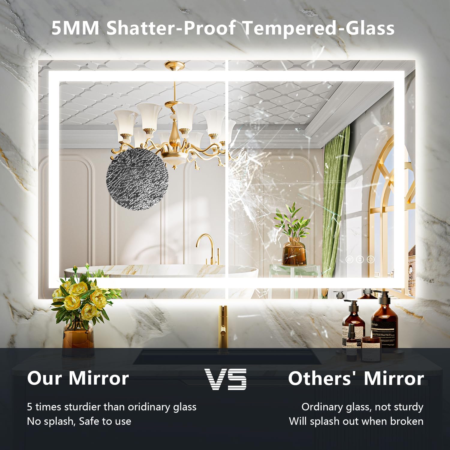 - 🔥【Anti-Fog/Defog, One Hour Auto-Off】- Are you still troubled by the fog on the mirror after shower? This anti-fog lighted bathroom mirrors wall mounted can free you from this trouble. Turn on the anti-fog function before showering can always maintain a clear reflection. Turn on the defogger after showering can quickly remove the water vapor on the mirror surface. No need to wipe the mirror after bathing, freeing your hands. The anti-fog function will auto turn off after one hour.