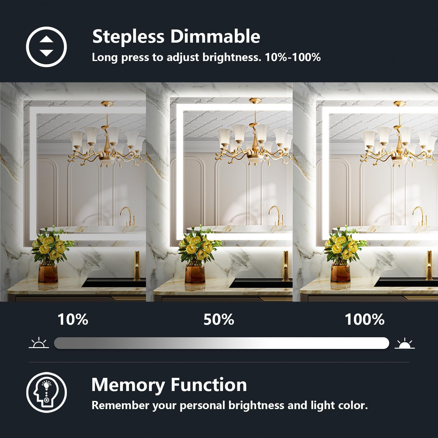 - ✨【Color Changeable & Brightness Adjustable & Memory】- Yeelait lighted mirrors for bathroom wall features multiple light settings that are easily controlled with sensitive touch buttons. Short press the button to change the light color: White (6000K) - Neutral (4000K) - Warm(3000K), long press the button to dim the brightness to your comfortable level (100%~10%). The Smart Memory Function will record the lighting setting and keep the previous lighting status after turning off and on.