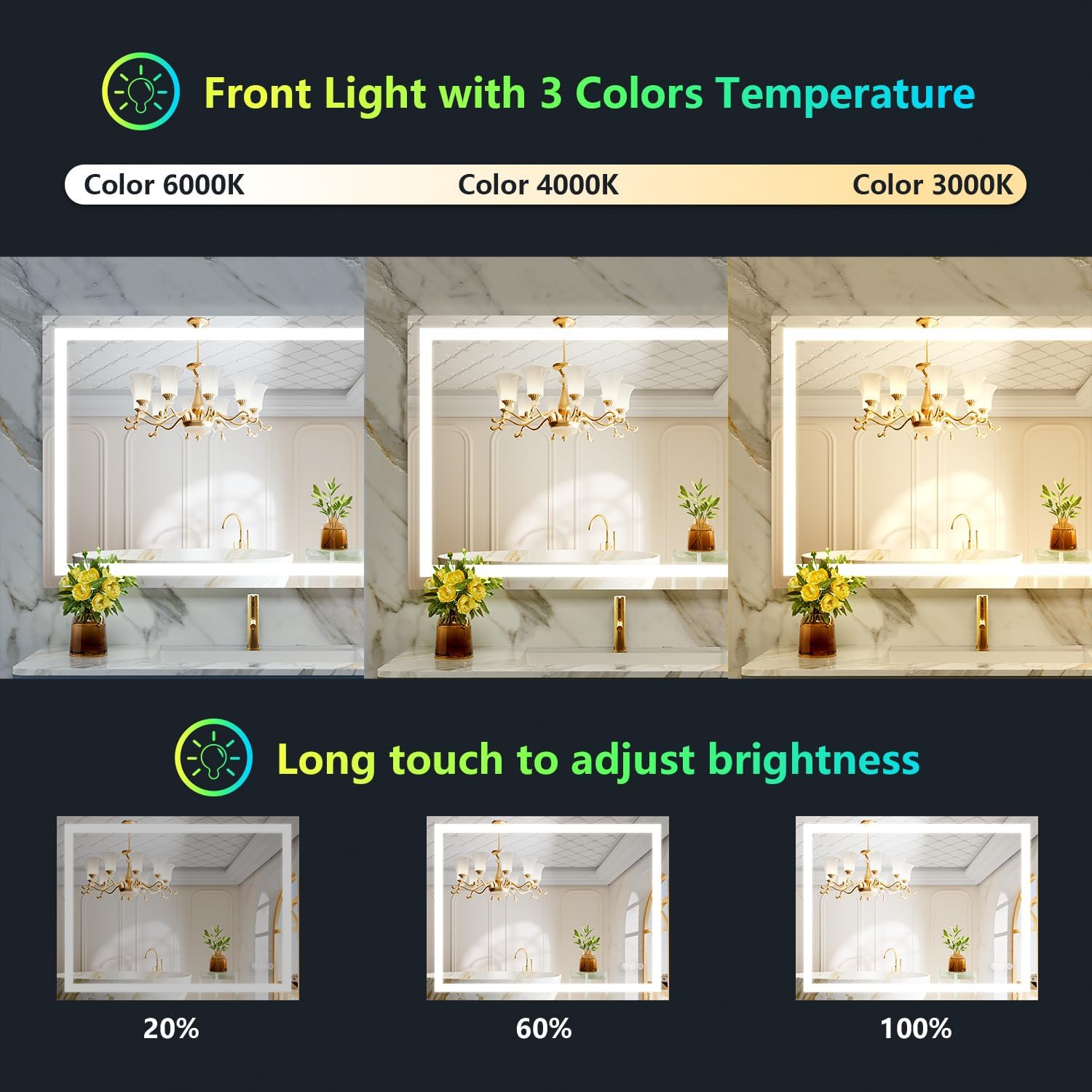 - 💎【3+8 Light Colors, Make a Difference】- This led mirror for bathroom has 3 front light modes: warm(3000K), white (4000K) and cold (6000K). RGB backlit has 8 light modes: warm / white / cold / flowing colorful / purple / red / green / blue. THE BACK LIGHT CAN BE WHITE ONLY! The muli color tone options are what makes this led vanity mirror and what makes your bathroom truly difference.