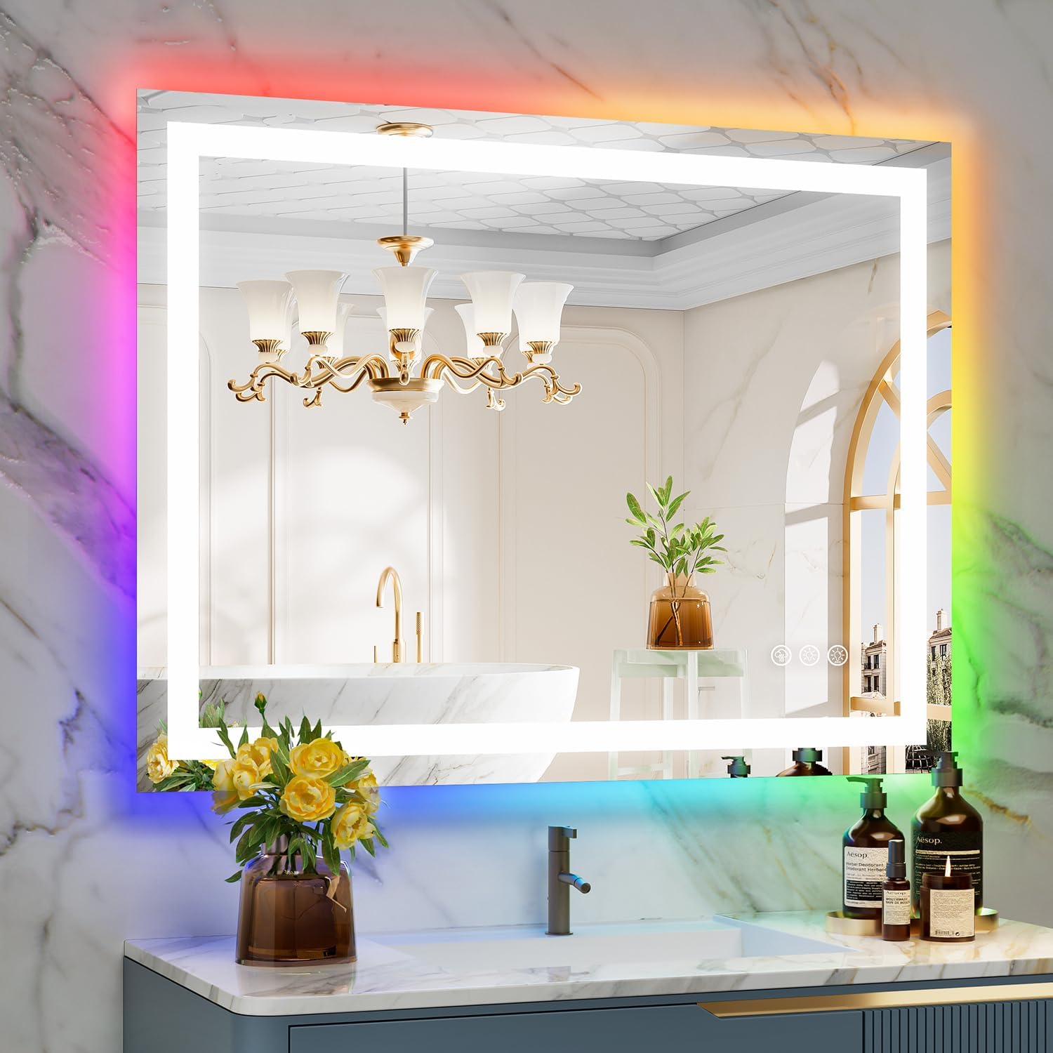 40x30 Inch RGB LED Bathroom Mirror Front Light and RGB Backlit Lighted Vanity Mirror for Bathroom Wall Mounted Dimmable Anti Fog Memory Shatter-Proof IP54 Waterproof Horizontal/Vertical