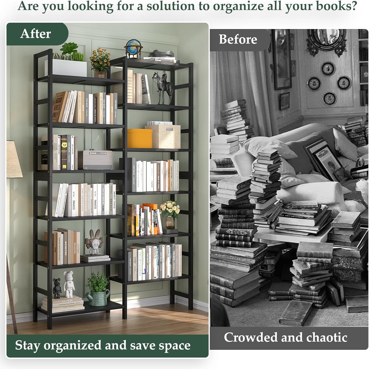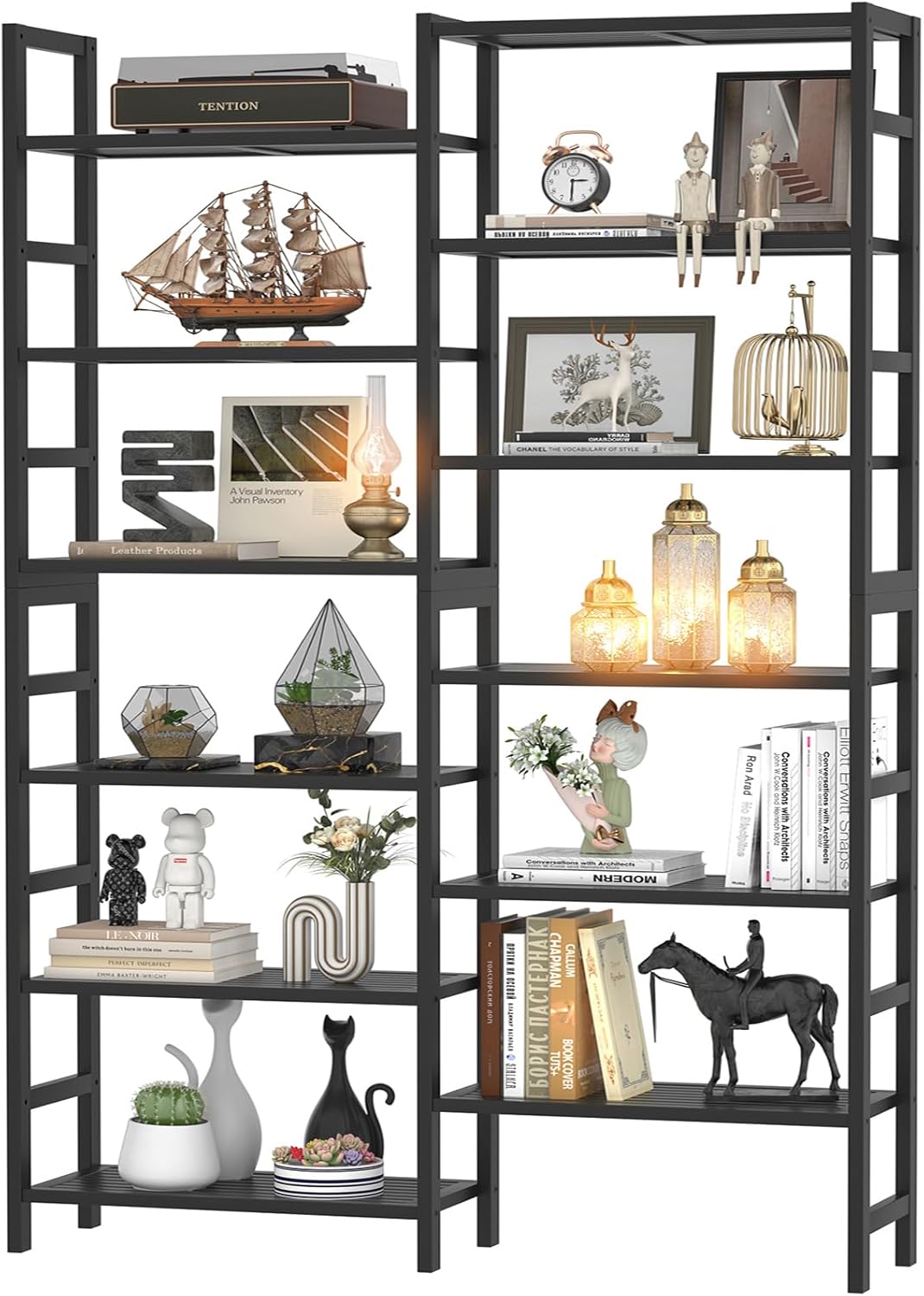 - Massive Storage Space: Dimensions are 41.14” W x 72.44” H x 10.63” D. The 6-tier double wide bookshelf features 12 individual open shelves, providing ample space for your books, collectibles, decorations, potted plants, photo frames, and more. Each layer can hold up to 44 lbs, for a total weight capacity of 528 lbs.