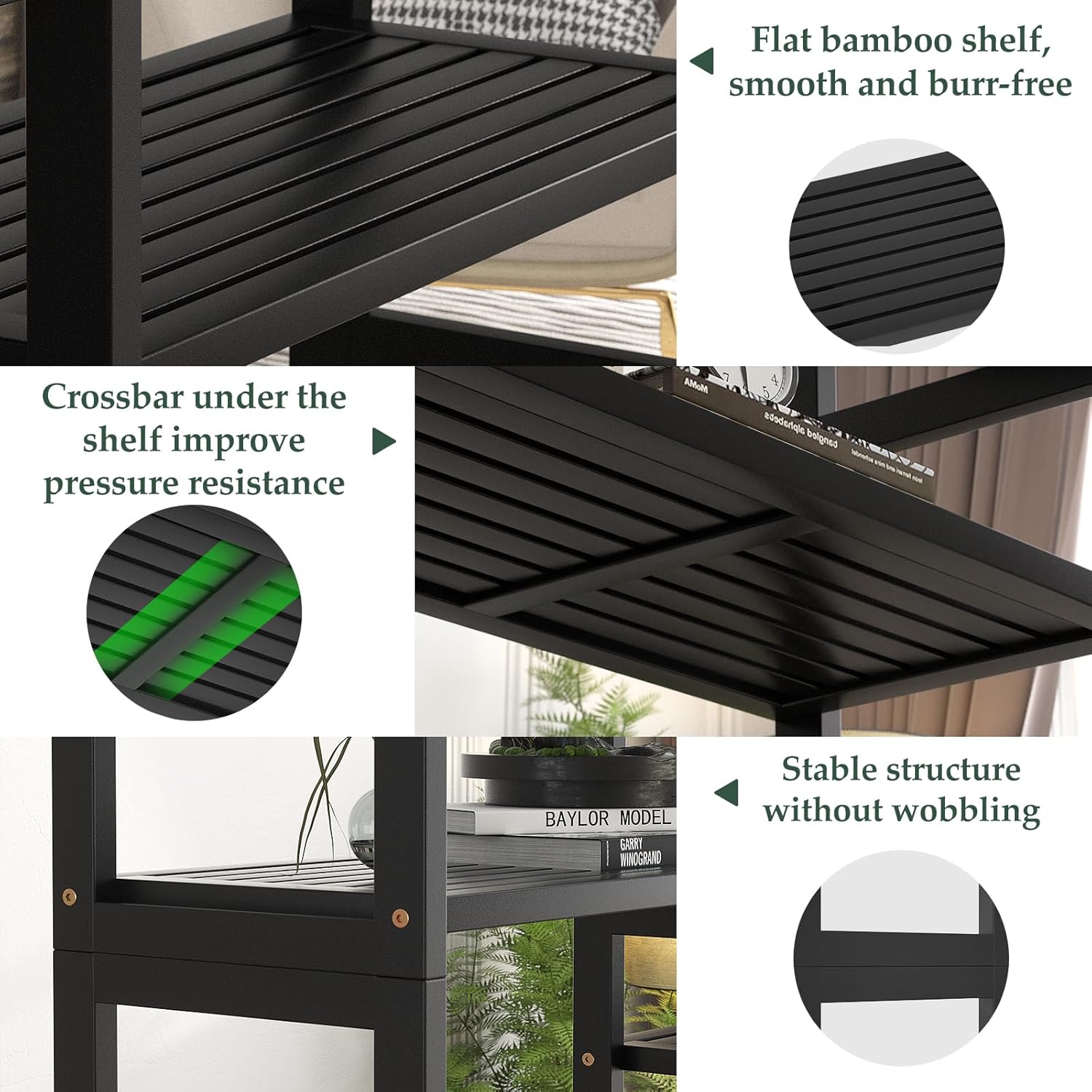 - Sturdy Structure: Cube structure ensures stability. A crossbar underneath each shelf for added durability. Please fix the bamboo bookshelf to the wall with the included anti-tip device for your and your family’s safety.