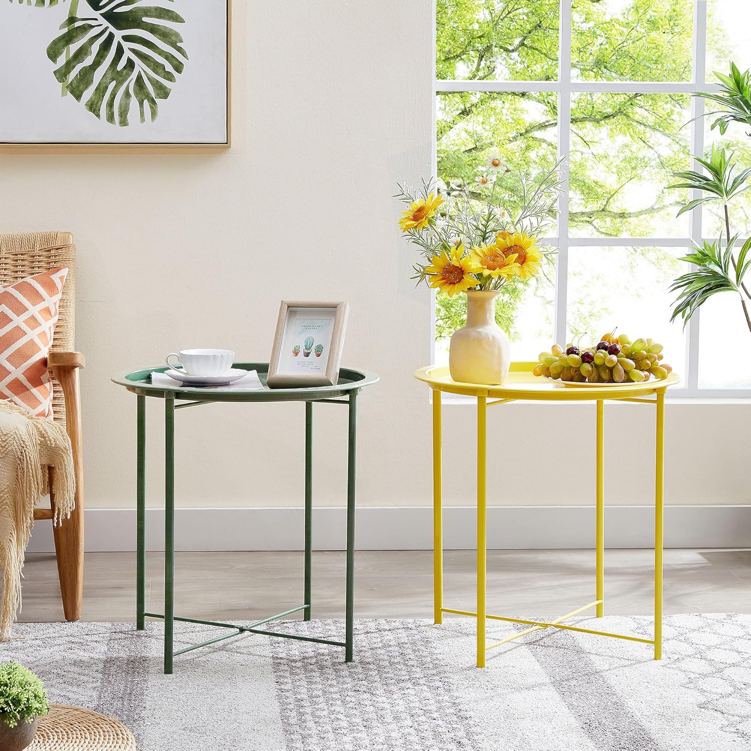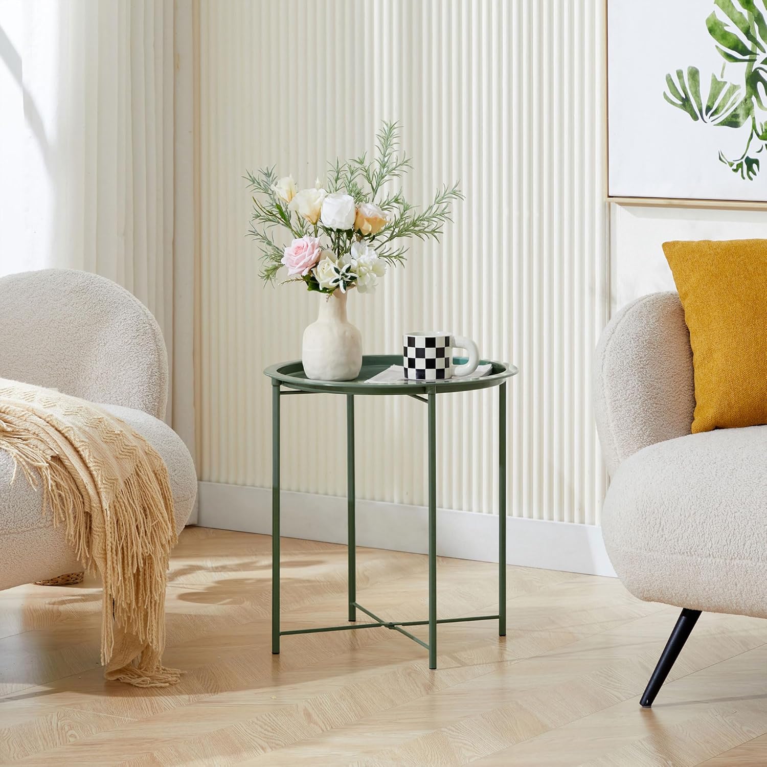 VECELO Side/End Table, Folding Round Metal Anti-Rust and Waterproof Outdoor or Indoor Tray for Living Room Bedroom Balcony and Office, 1 PCS, Dark Green