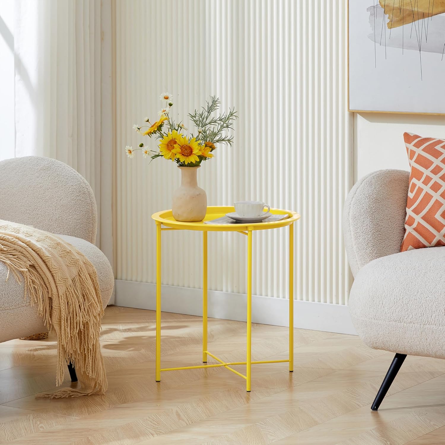 VECELO Side/End Table, Folding Round Metal Anti-Rust and Waterproof Outdoor or Indoor Tray for Living Room Bedroom Balcony and Office, 2 PCS, Yellow