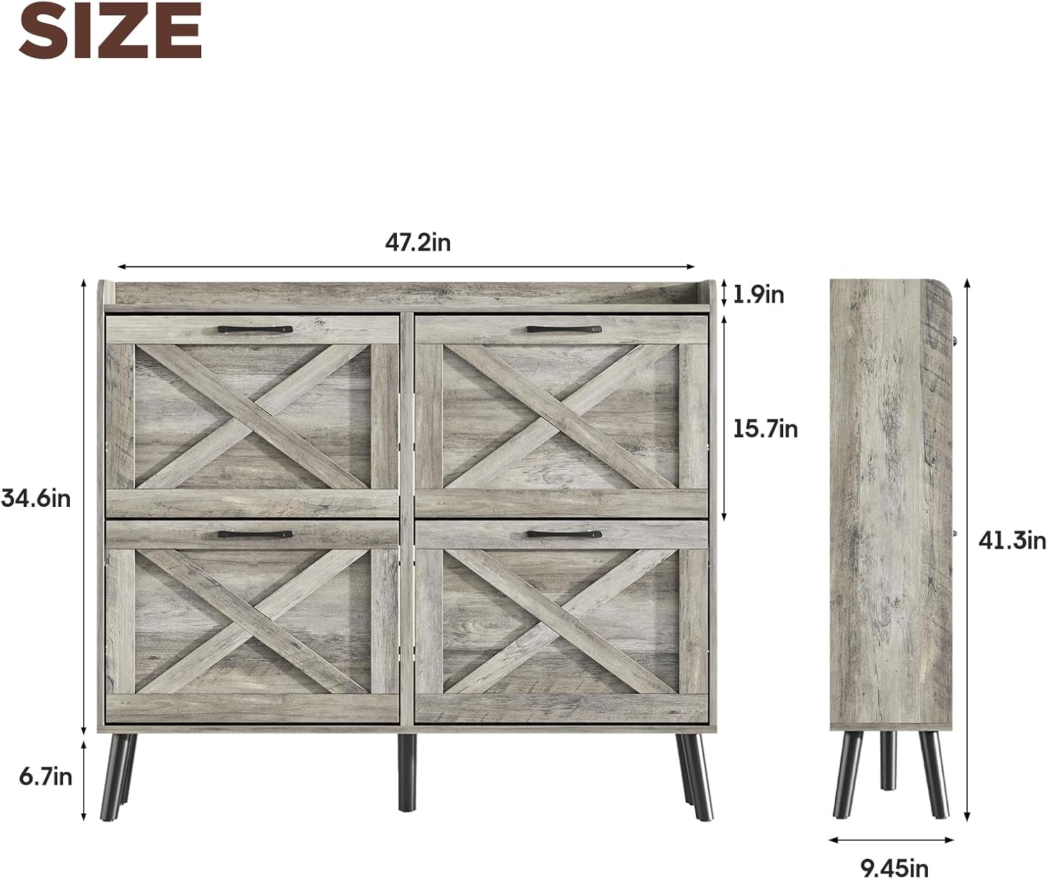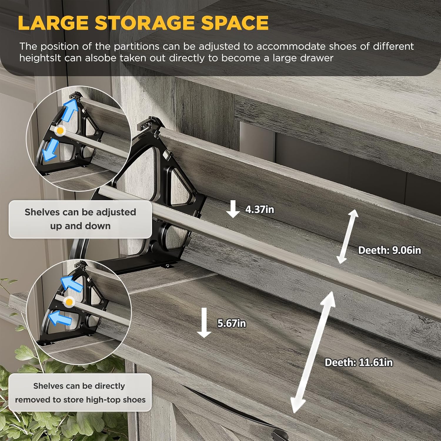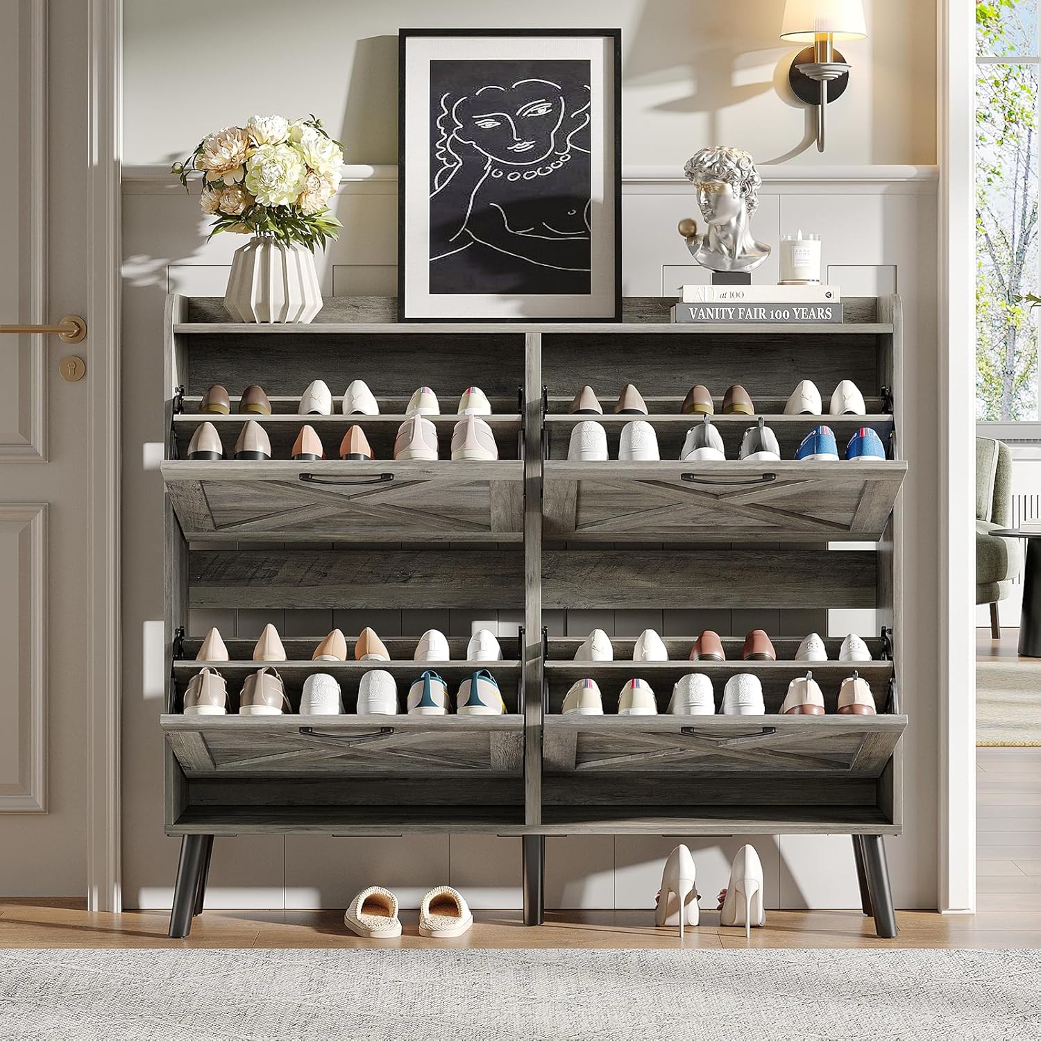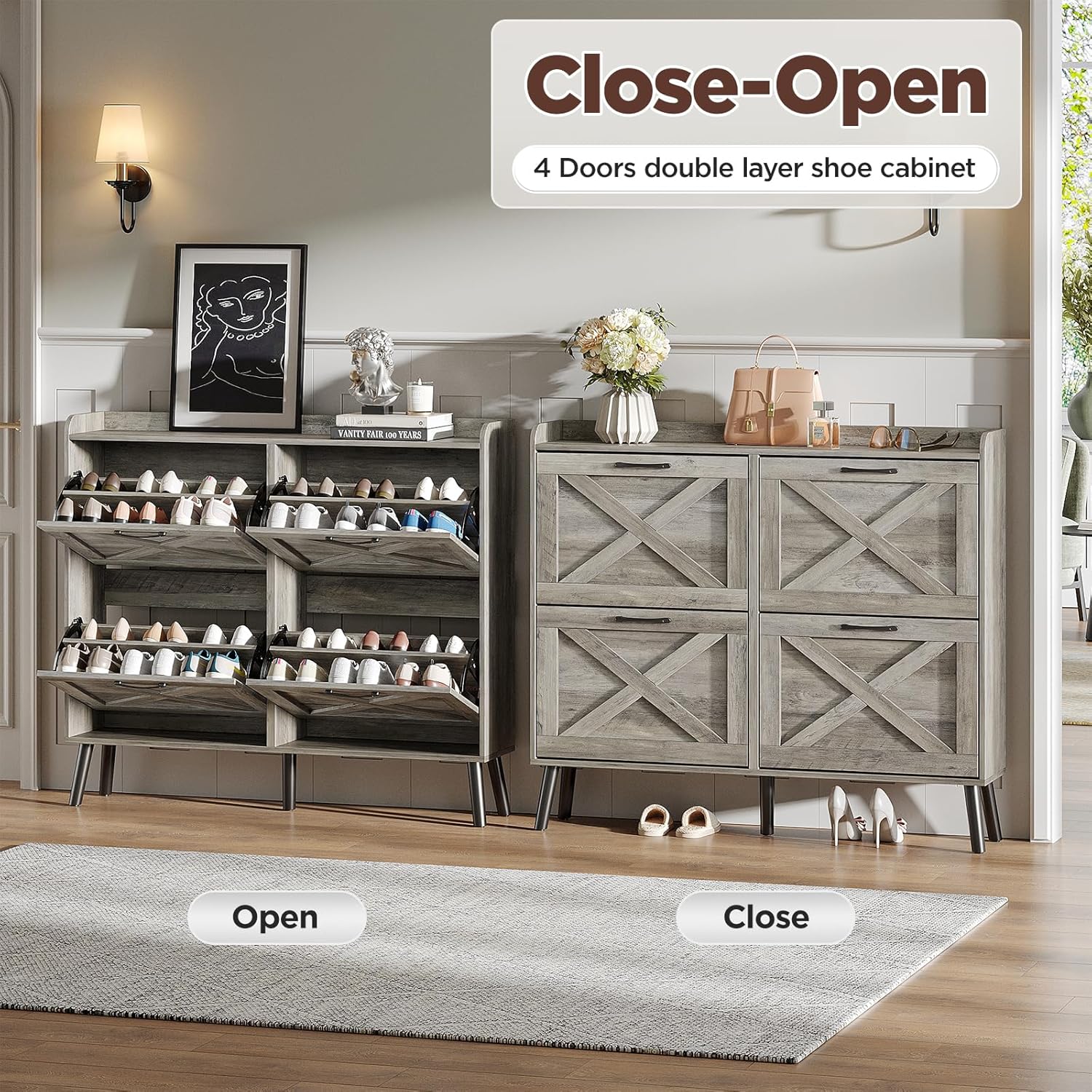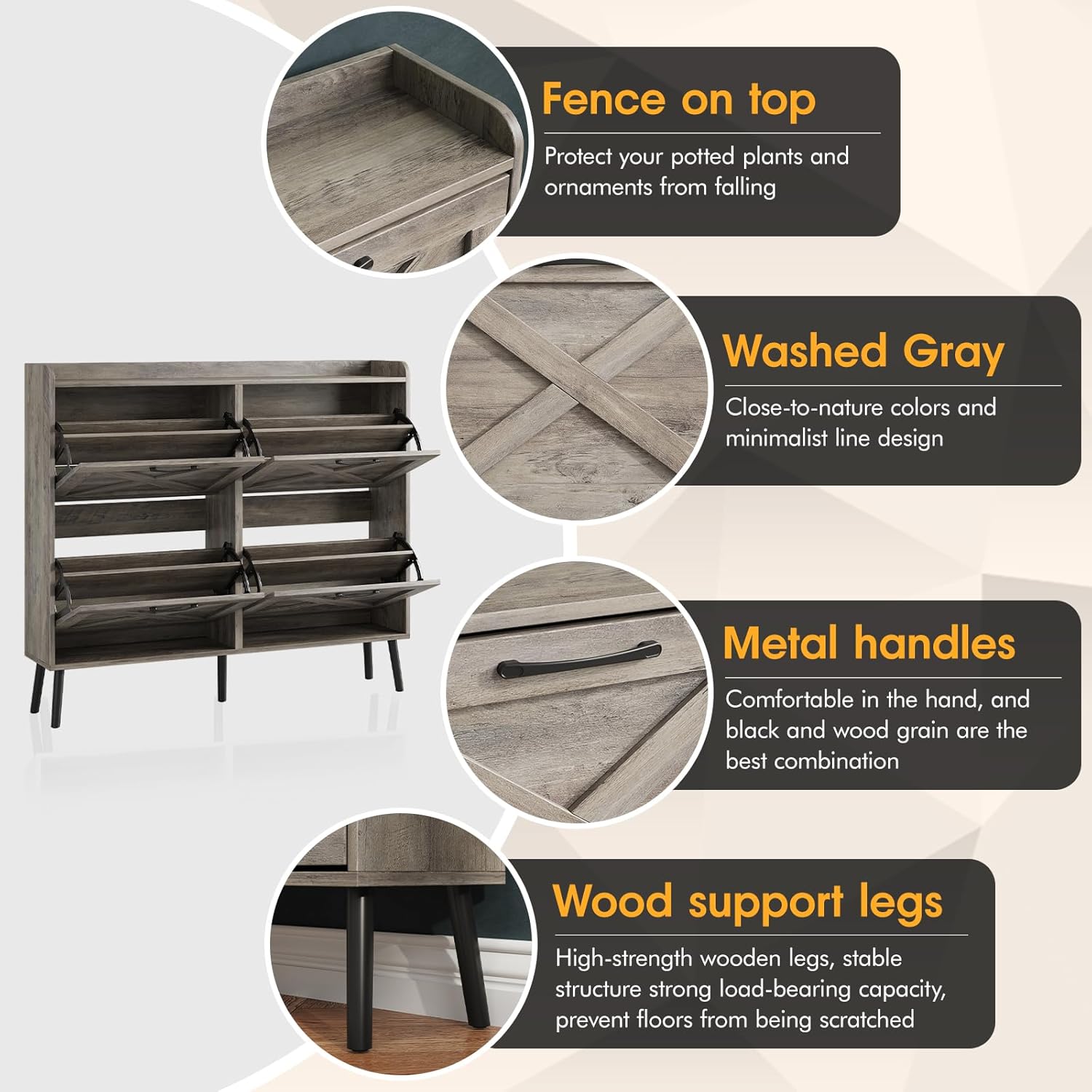 - Entryway Shoe Cabinet: The hidden shoe storage cabinet with 4 flip doors, stylish and simple washed grey makes it a neat and beautiful finish and looks great in many different home styles. Perfect for placing in the entryway, hallway, living room, or porch, provides a neat looking in your home and space saving