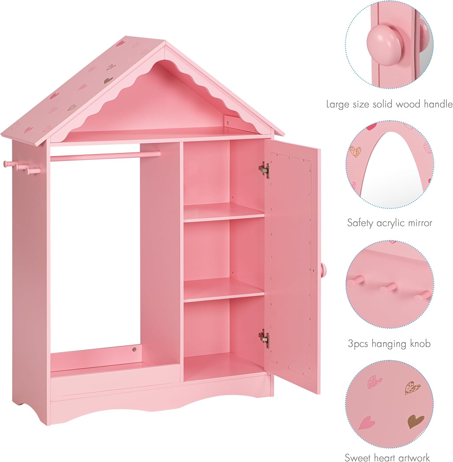 - LOVELY APPEARANCE & PERFECT GIFT: With a house-like appearance, this kids armoire brings a touch of warmth and loveliness to your kid’s room. Sweet heart artwork to decorate the closet. This kids wardrobe closet will surely be a wonderful present for your little princess. Every little girls cannot refuse such a fantastic dress up wardrobe, Perfect for girl's room or playroom.
