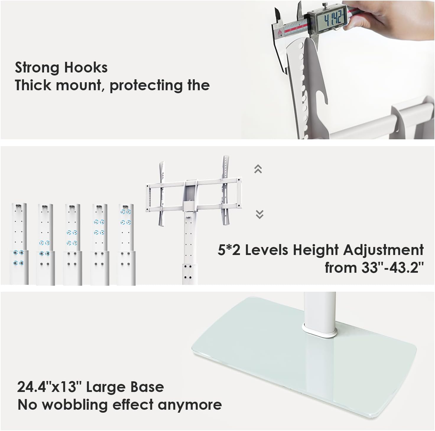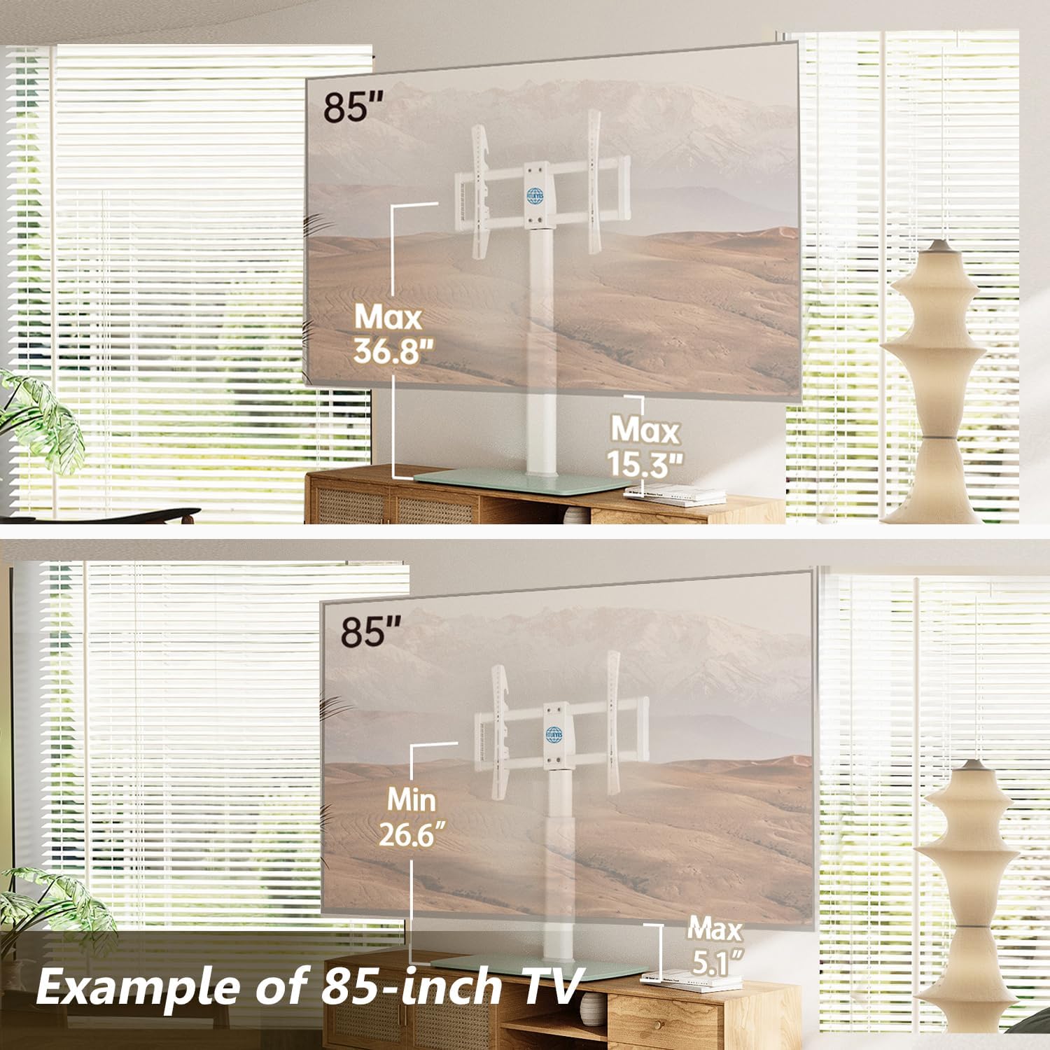 - 【10-Level Height Customization】This tv stand mount will adapt your TV’s height across 5 adjustable pole positions and 2 bracket tiers,perfect for ergonomic viewing in bedrooms or living rooms. The height adjustable TV stand features the Anti-tip engineering to keep 85 inch screens rock-solid!