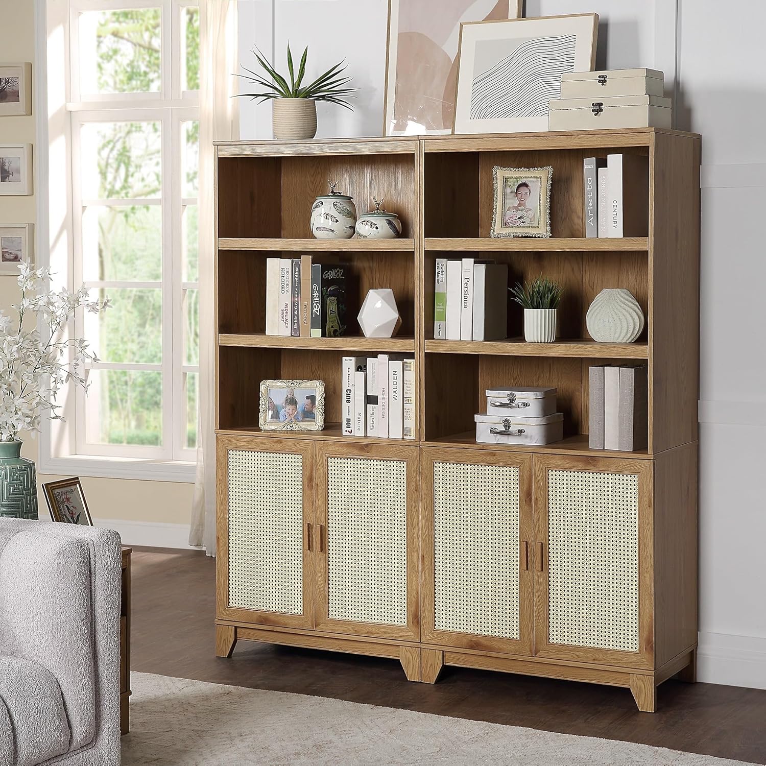 Manhattan Comfort Sheridan Modern Cane Bookcase with Adjustable Open Shelves, Soft Close Doors, and Concealed Compartments, Versatile 3 Tier Bookshelf Storage for Home and Office, Set of 2, Nature