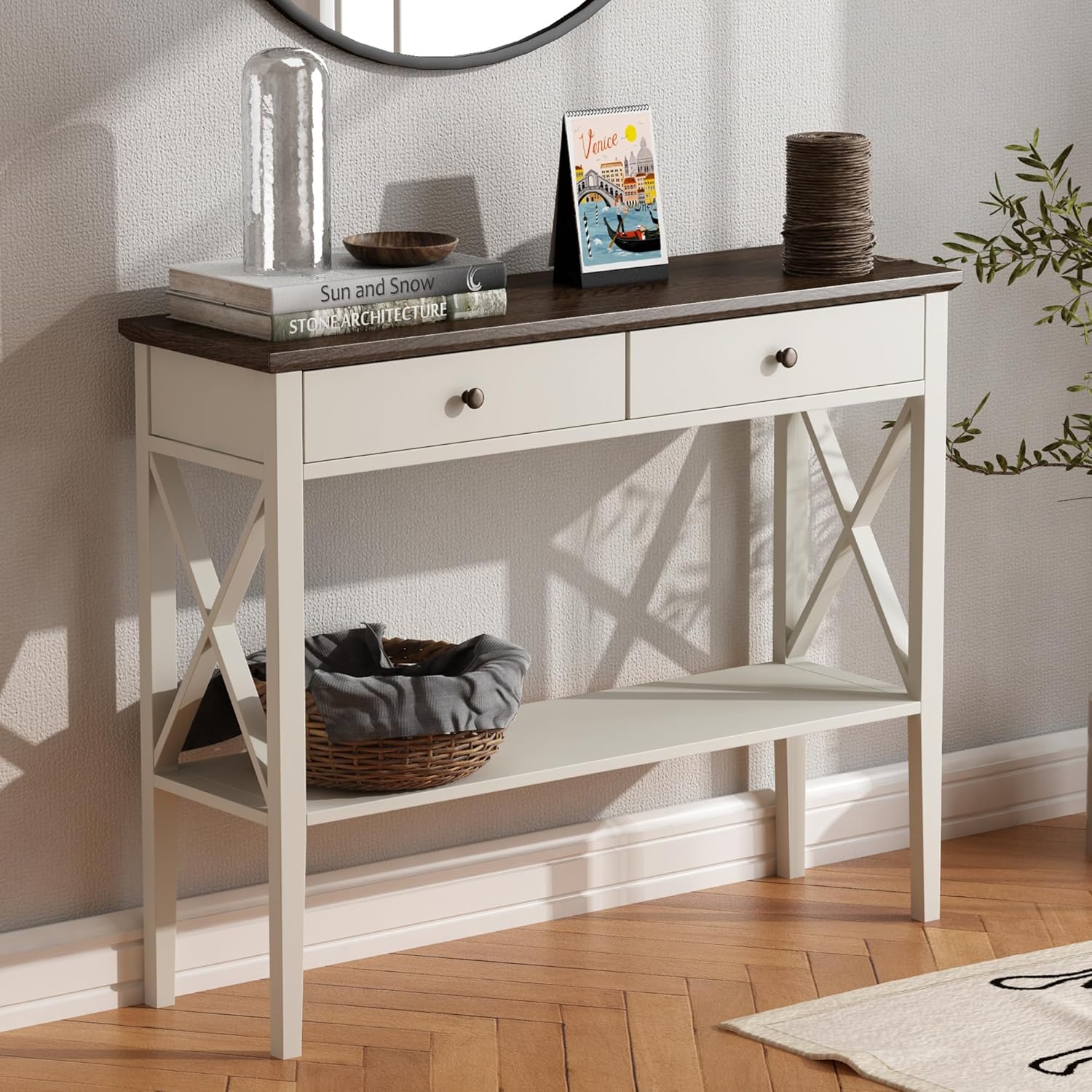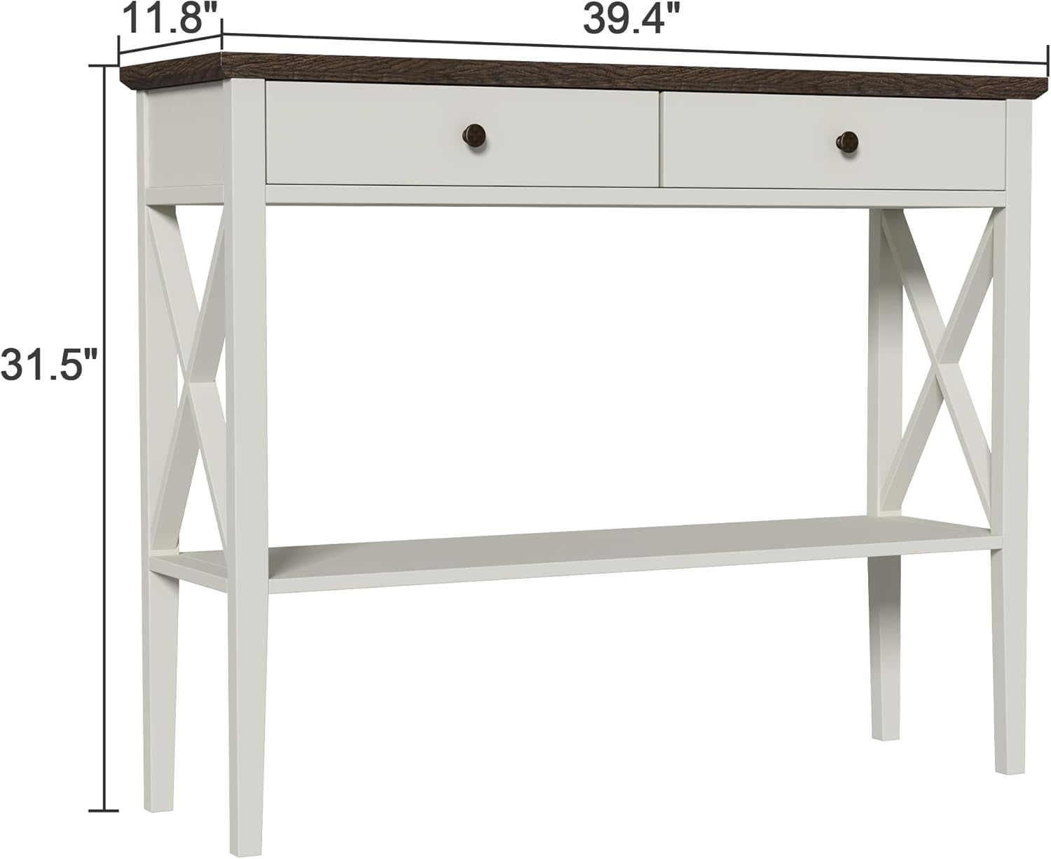 ChooChoo Farmhouse Console Table with Drawers, Narrow Wood Accent Sofa Table Entryway Table with Storage Shelf for Entryway, Front Hall, Hallway, Living Room, Antique White & Brown