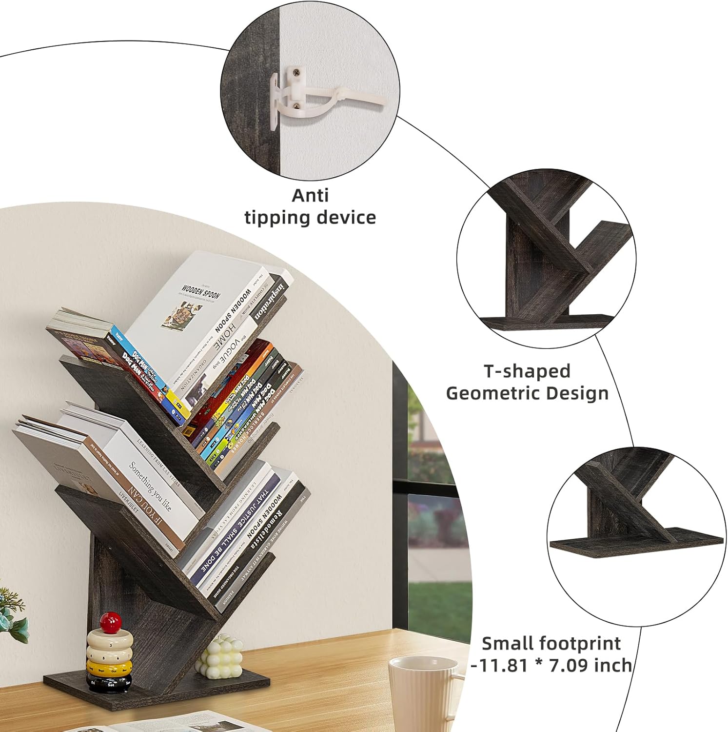 5 Tier Tree Book Shelf, Small Desktop Bookshelf with Storage Organizer, Wood Bookcase, Desk Display Bookshelves, Floor Standing Organizer Bookcases for Living Room,Bedroom,Office-Dark Grey